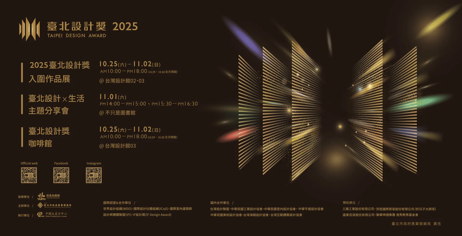 政府網站資料開放宣告 │ 隱私權及資訊安全政策 │ 網站導覽主辦單位:臺北市政府產業發展局營運單位:財團法人中國生產力中心聯絡電話:(02)2698-2989 分機:03296 朱小姐 或 01814 陳小姐 (服務時間 AM 08:30 - PM 05:30)聯絡地址:221432 新北市汐止區新台五路一段79號2樓 電子信箱:taipeidesignaward@gmail.com版權所有 © 財團法人中國生產力中心2024 臺北設計獎報名系統智慧財產權為財團法人中國生產力中心所有禁止侵害,違者必究臺北設計獎網站以繁體中文與英文為官方使用語言網站更新時間: 2025/10/07 19:03:53累計瀏覽人數: 3937193