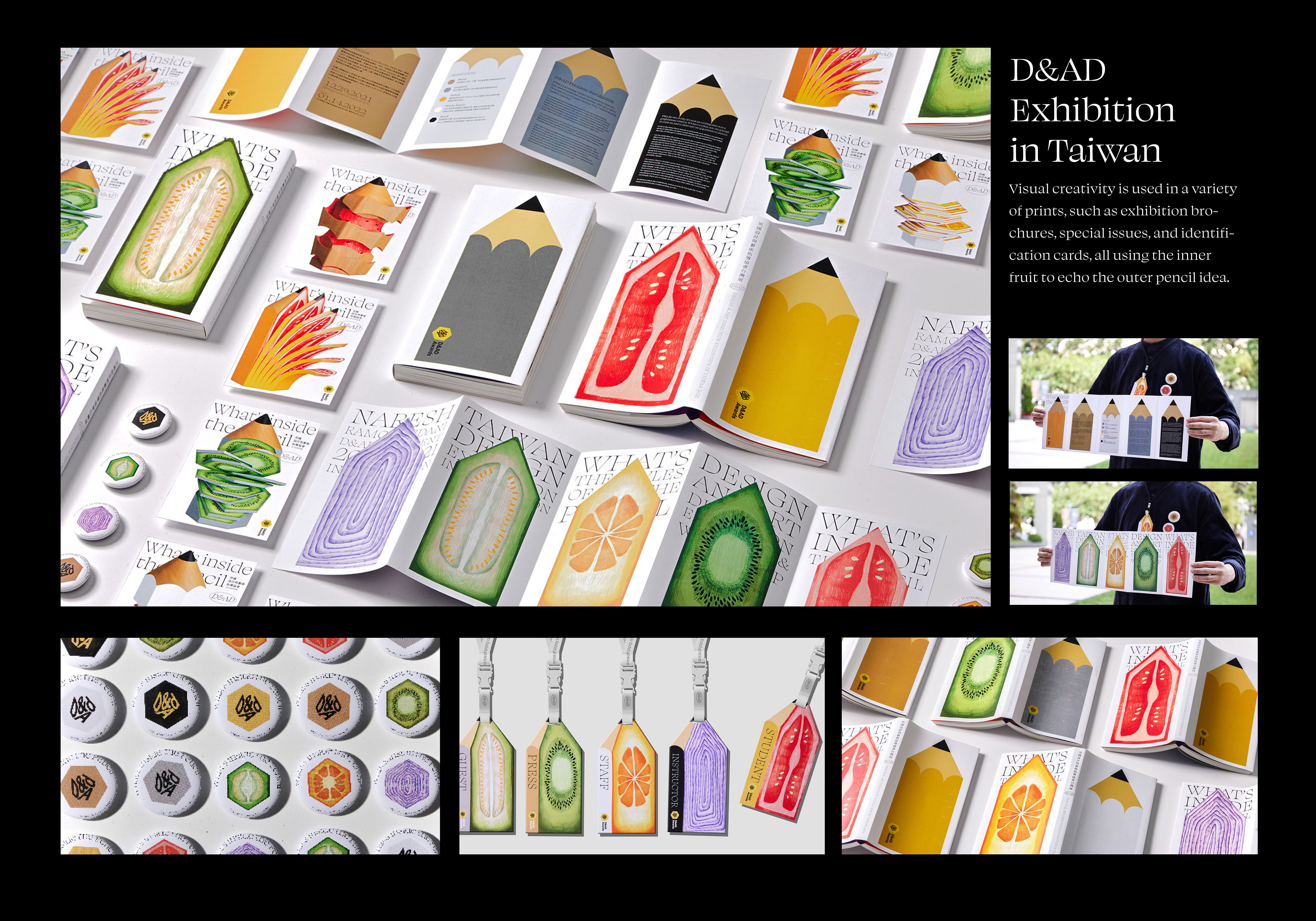 英國D&AD獎是全球知名設計獎項,臺灣科技大學設計系作為設計教育單位,除了引進D&AD獎的得獎作品外,同時也策劃新血獎工作坊,藉由熟悉曾指導學生獲新血獎的指導老師開設工作坊,針對新血獎的簡報內容的分析,指導學生進行設計。D&AD獎最具代表性的便是獲獎獎座-黃鉛筆,不同顏色鉛筆代表不同層級獎項,而台灣盛產水果世界知名,在針對D&AD獎的活動海報時便想透過解叵鉛筆的方式讓裡面的水果顯露,把世界知名獎項與台灣本地特色連結起來,引起觀眾的好奇心。從2021年12月29日到2022年1月14日,當冠狀病毒大流行大多數事件都轉移到網上時,為期兩週,設計愛好者將有機會在台灣科技展館一睹英國設計與藝術指導獎(D&AD)的最佳作品,難得的機會。台灣科技大學(Taiwan Tech)舉辦D&AD展,作為學校設計系與國際社會的宣傳,讓台灣設計界和國際設計界都能使用台灣大學舉辦的D&AD展 科技讓外界更多地了解台灣科技大學的設計。在展覽中,外部和內部圖像是對應的,外部圖像是鉛筆,內部圖像是水果片。 當人們從外面走時,他們會發現“鉛筆裡面是什麼。
