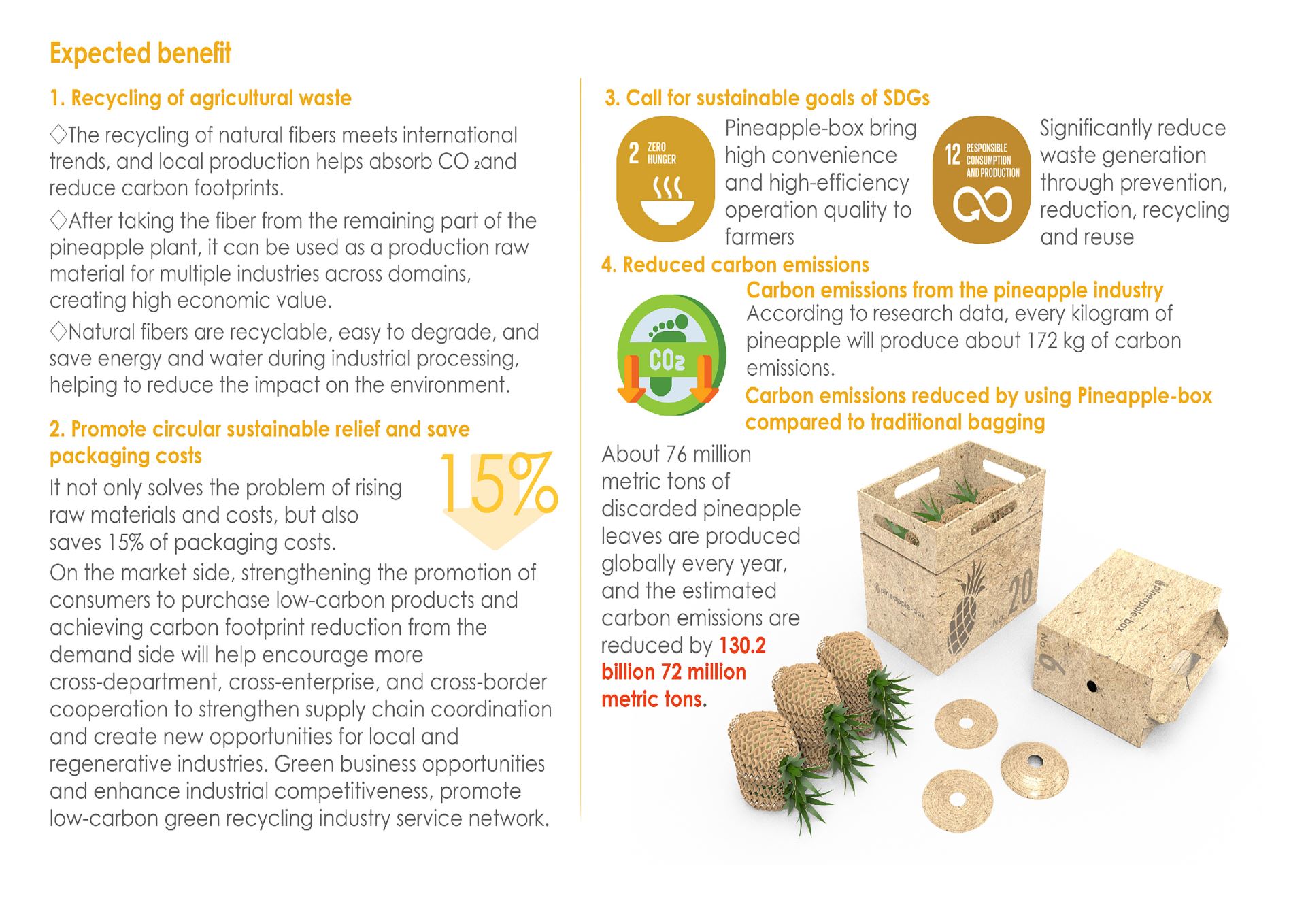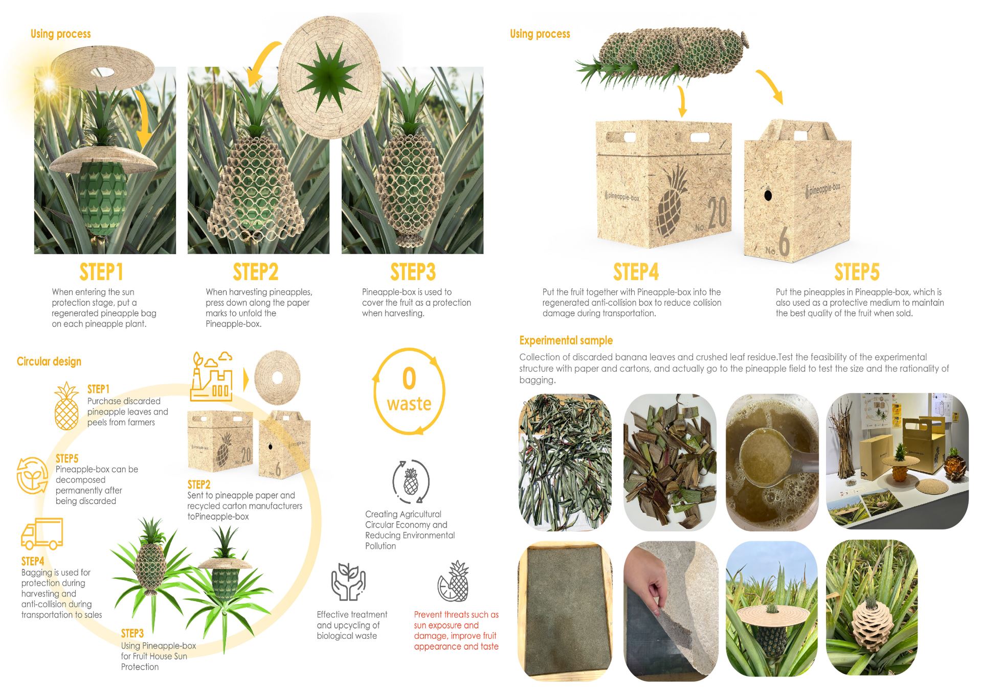 Pineapple-box is a buffer bag and sales box that uses waste pineapple leaves and peels to regenerate the agricultural waste to protect the fruit. It has the effect of protection and buffering from planting to transportation. It can not only solve the problem of huge pineapple waste, also reduces the use of non-environmentally friendly sun protection and cushioning bags such as plastic materials in a sustainable manner, and also reduces the consumables of repeatedly adding cushions during the transportation process, improving the best pineapple production and delivery quality.