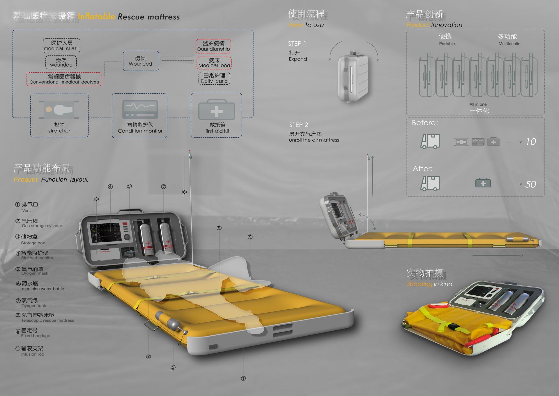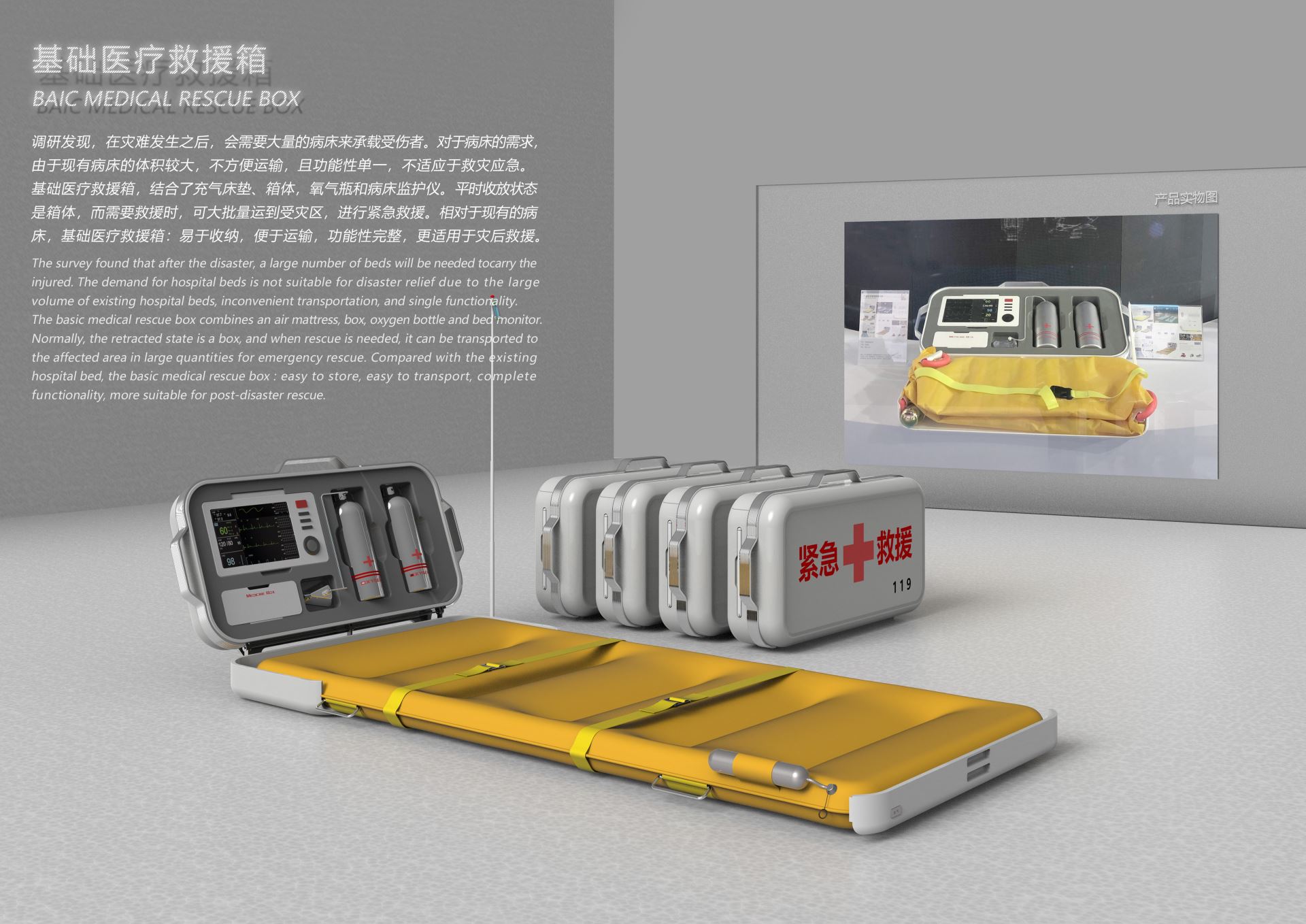 The survey found that after the disaster, a large number of beds will be needed to carry the injured. The demand for hospital beds is not suitable for disaster relief due to the large size of existing hospital beds, inconvenient transportation, and single functionality. The basic medical rescue box combines an air mattress, box, oxygen bottle and bed monitor. Normally the retractable state is the box, and when rescue is needed, it can be transported to the affected area in large quantities for emergency rescue. Compared with existing hospital beds, basic medical rescue boxes: easy to store, easy to transport, complete in functionality, and more suitable for post-disaster rescue.
