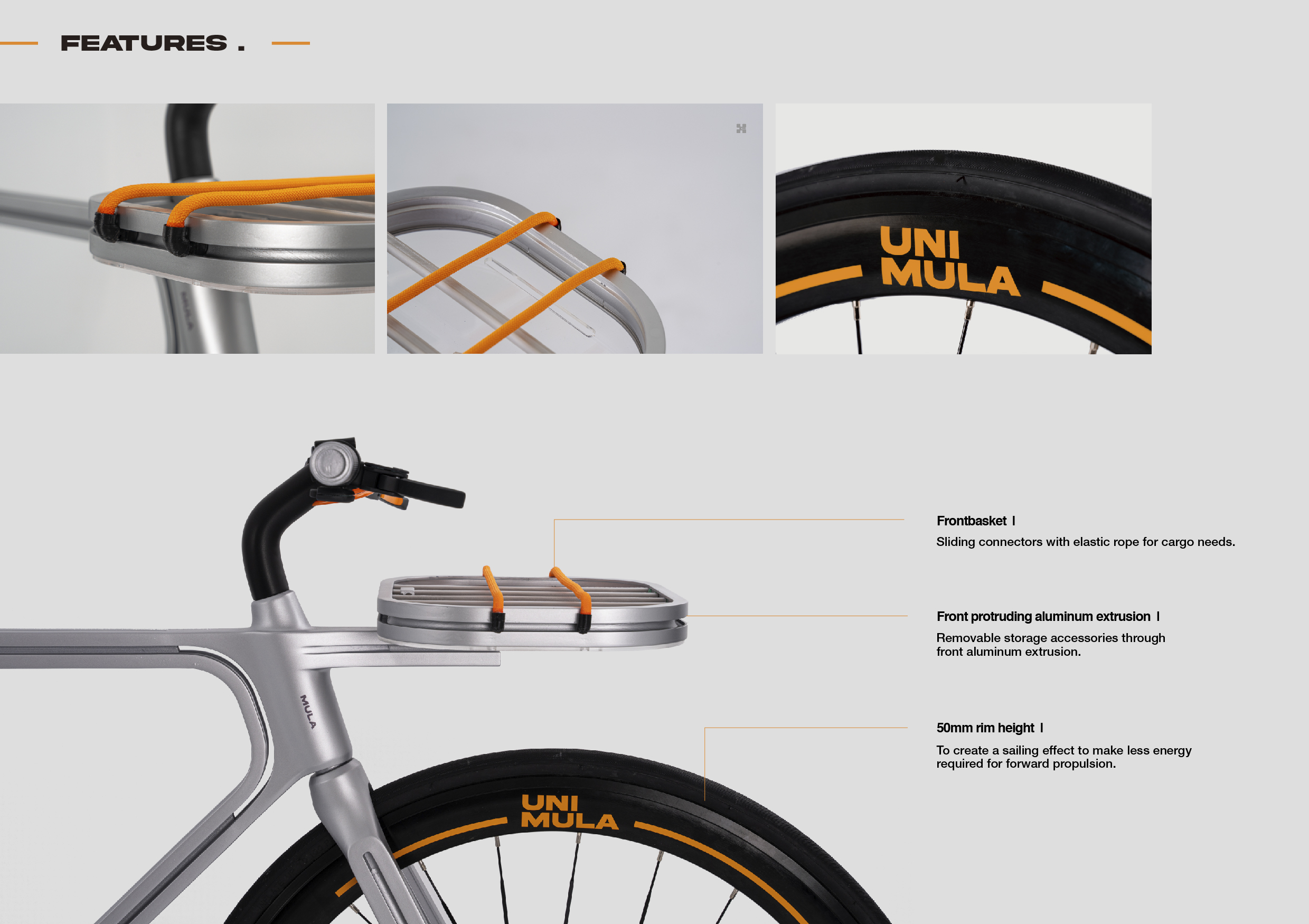 作品的最大的特色亮點在於鋁材的應用,其中車架前三角的環狀結構的製程靈感來自於竹管工法中的「鑿管、包管」加工方式進行造型變化,鑿開鋁擠型的背部並受熱彎曲形成特殊的曲線造型,又將鋁擠型的溝槽作為放置配件的卡扣軌道,讓此平易近人的材料發揮它獨特的美型及功能兩方面的全新風貌。