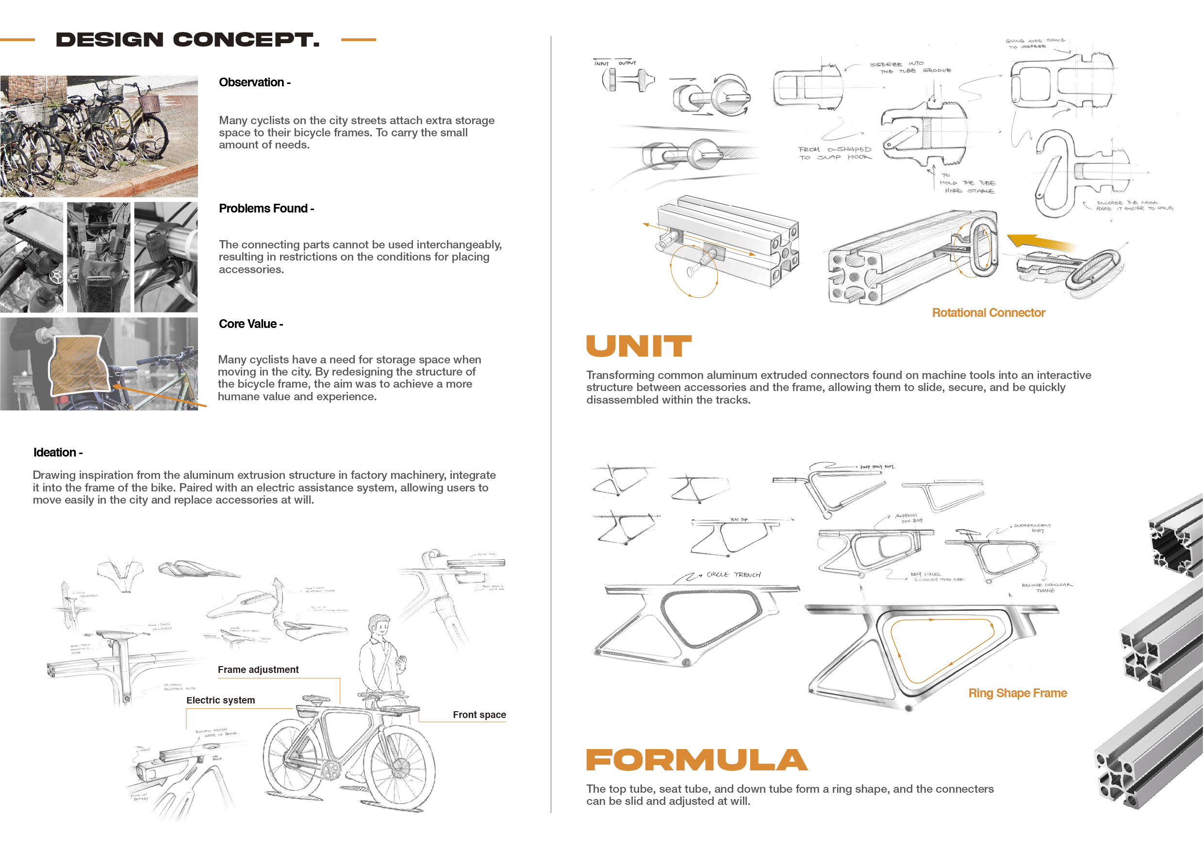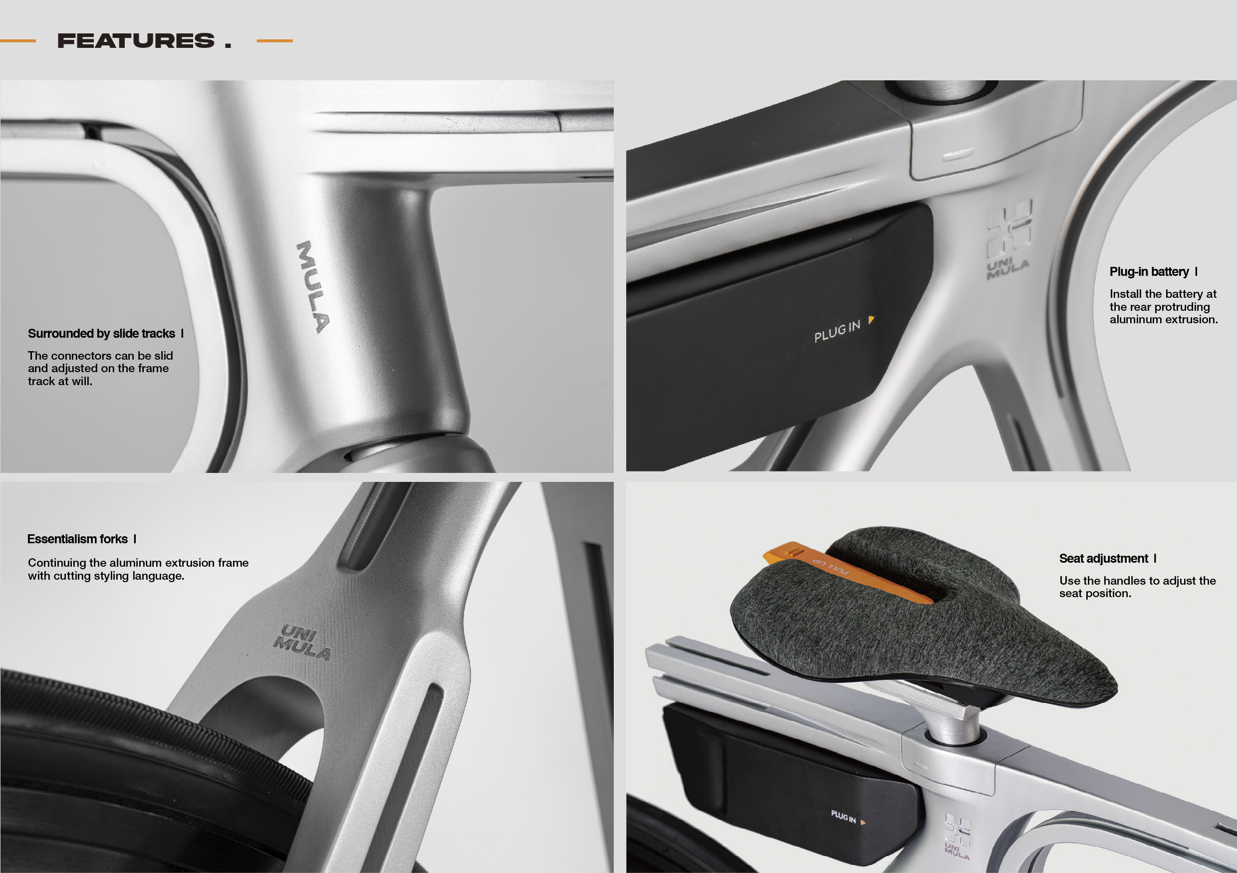 鋁擠型城市電動單車將機床結構所使用的鋁擠型作為設計的基礎,並結合電動輔助系統,讓使用者能夠在城市當中輕鬆移動、方便替換日常所需的不同配件種類及數量,利用鋁擠型能夠在軌道上滑動的特點,使得使用者可以藉由尾端的軌道抽離電池攜帶至任意的地方進行充電,減少車輛必須進入室內空間插電的繁複動作,並且在其他軌道中能夠快速、簡單的依照每個人的不同需求去安裝配件以及隨意地調整配件想要在車架上擺放的位置。