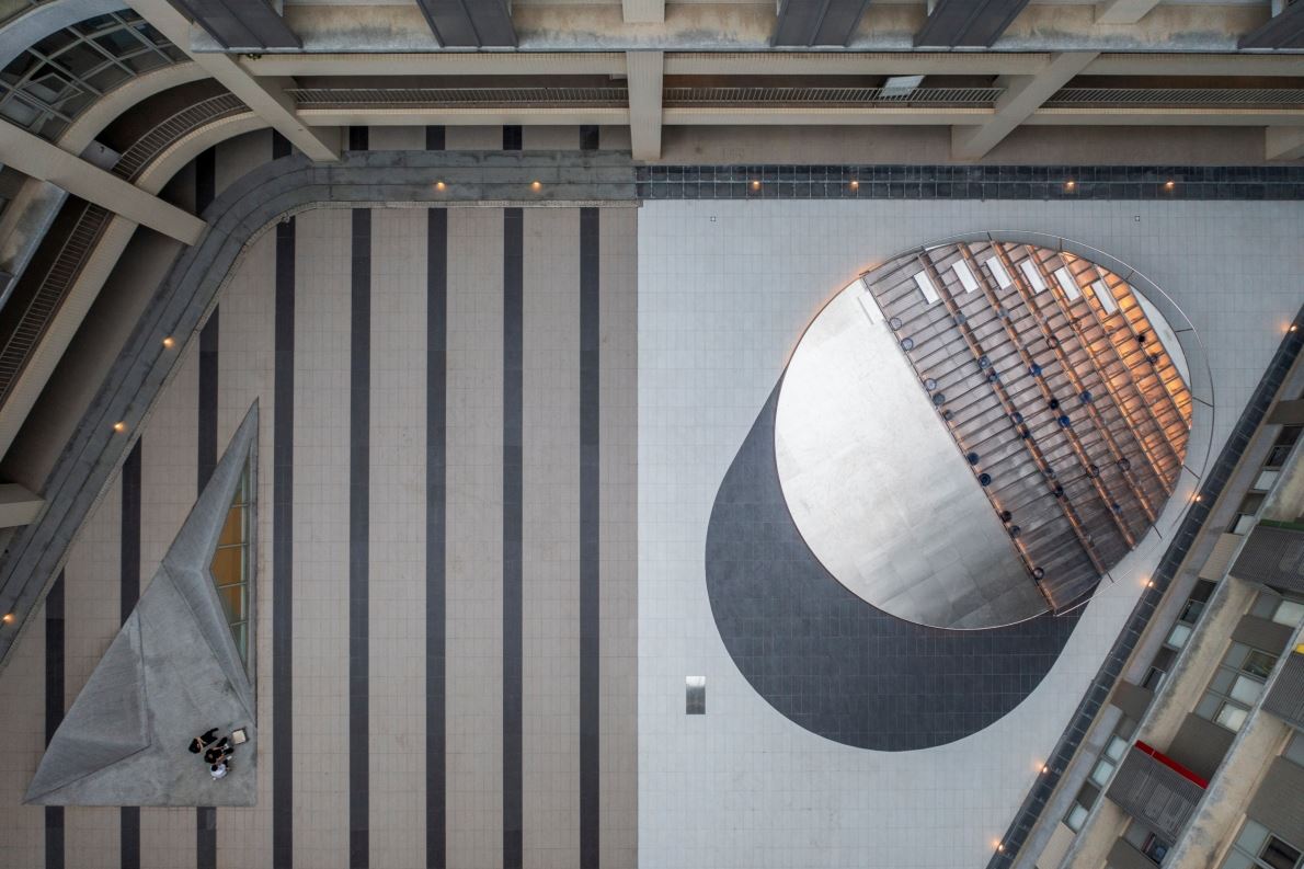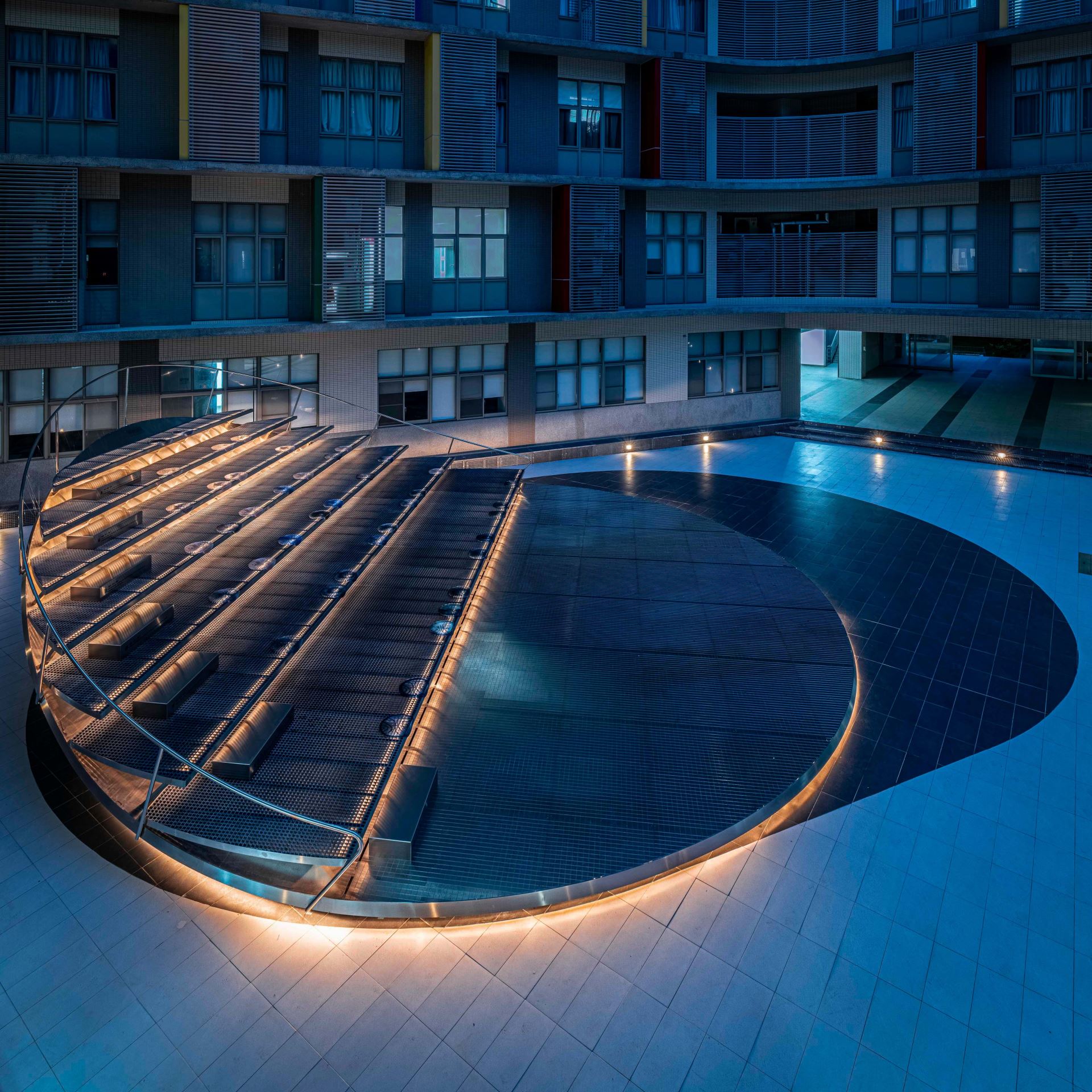 紀念碑通常用來表達對個人敬意,但傳統的等高青銅雕塑、基座和牌匾設計,往往與普通大眾相距甚遠,難以建立深層連結。我們借鑒了紀念碑的概念,將其轉化為功能性的建築空間,使任何人在使用的同時,都能向傑出人士及其貢獻致敬。 這個設計旨在紀念黃炎松博士,他是台灣半導體產業界連續創業最成功的企業家之一。為了向黃博士表示敬意,我們從晶圓的圓形汲取靈感,以不銹鋼表現晶圓,將圓輕掀起來產生焦點,,吸引人群聚集,讓師生能夠輕鬆地坐在其中,成為交流和思想碰撞的樞紐。 結合藝術、設計和科技,座位區採用 3D 列印技術製成,選用漸層藍色、底部的水波結構和透明流暢的線條設計,呈現出如水珠撒落般的未來感與科技感,體現陽明交大電子物理系追求的創新精神。 七層階梯融入黃博士的成功哲學:「道、天、地、將、法、容、易」,激勵學生帶領團隊共同實現願景。我們希望利用這個機會,用設計啟發社交,讓學生、教師和遊客可以在這裡互動、發表研究,甚至望著天空發呆。我們期望「炎松之圓」戶外講堂能成為範例,鼓勵未來的紀念廣場設計能拉近與民眾的距離,成為應用典範。