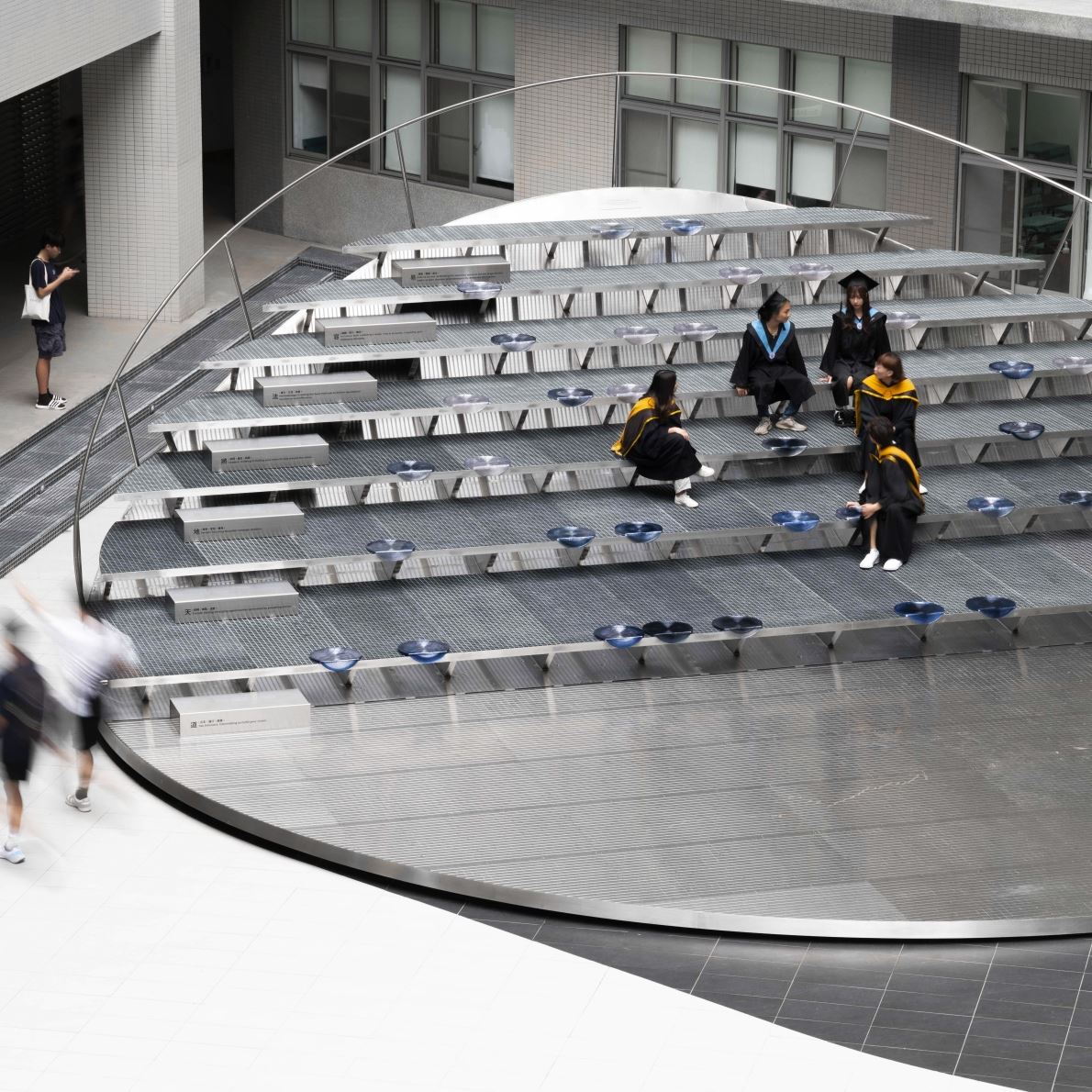 Monuments are used to pay tribute to individuals, but the traditional design of equal-height bronze sculptures is often far removed from the general public. In homage to Dr. Yen-Son Huang, a serial entrepreneur in Taiwan's semiconductor industry, we drew inspiration from the round form of a silicon wafer. Lifted the circle gently to create a focal point and attract crowds to gather so students and faculty could sit comfortably in it, making it a hub for communication and the collision of ideas. The seven steps incorporate Dr. Huang's philosophy of success: Mission (道), Trends (天), Terrain (地), Leaders (將), Methodology (法), Inclusion (容), and Path to Success (易). The robotic 3D-printed seating area, which uses gradient blue and water wave patterns to convey a futuristic sense, reflects the innovative spirit of NYCU. We want to utilize this opportunity to inspire social interaction through design, where everyone can interact, present their research, and even stare at the sky. We hope it will become a model for the future design of Monuments.