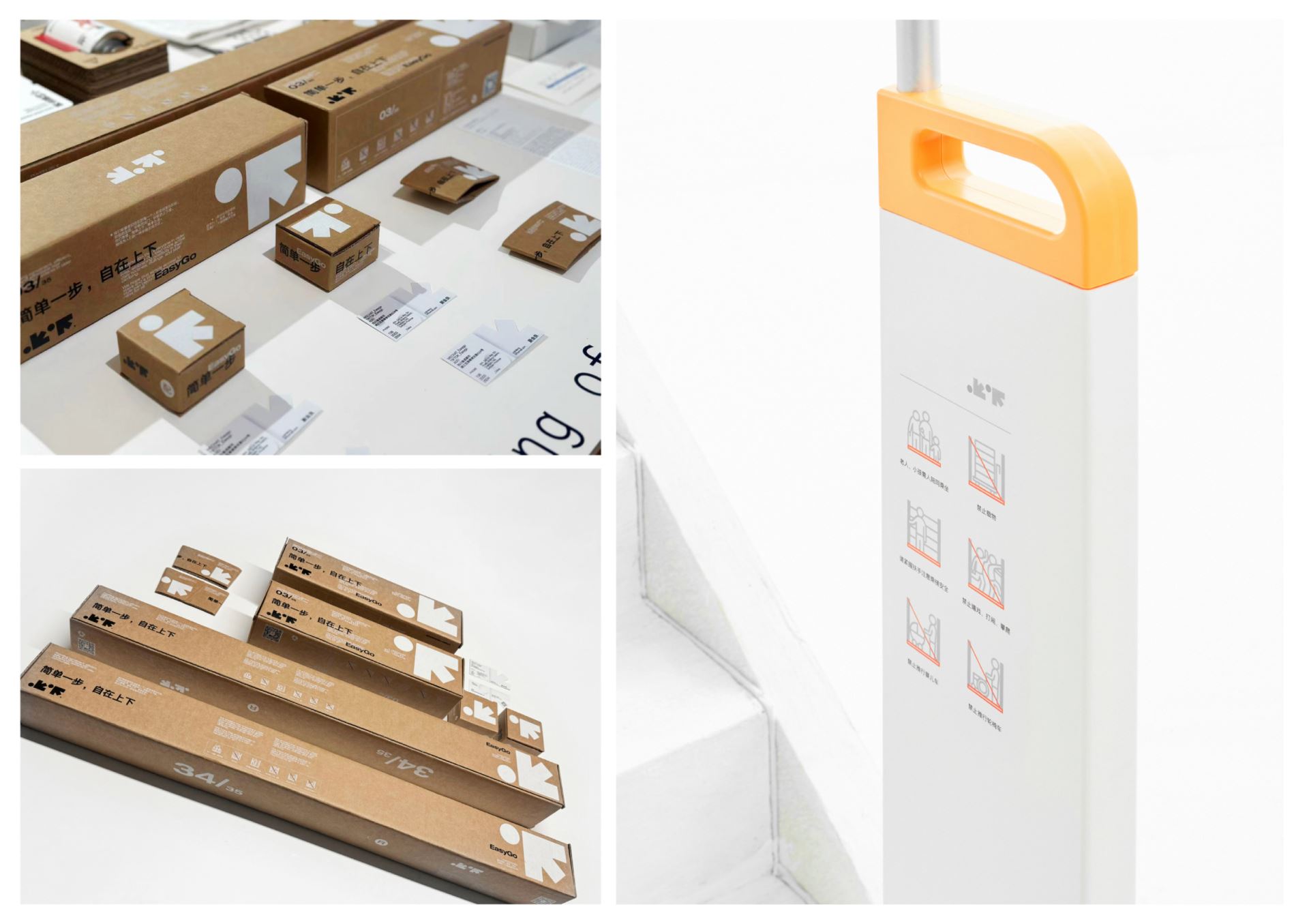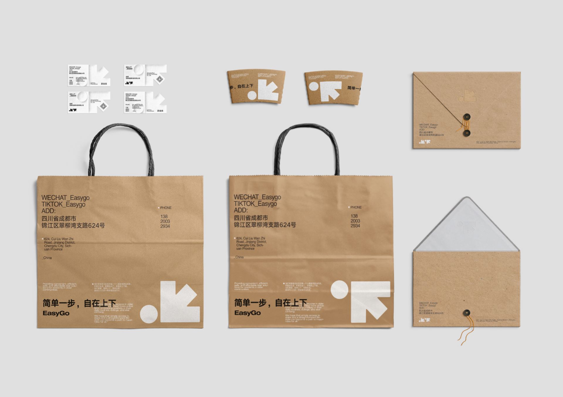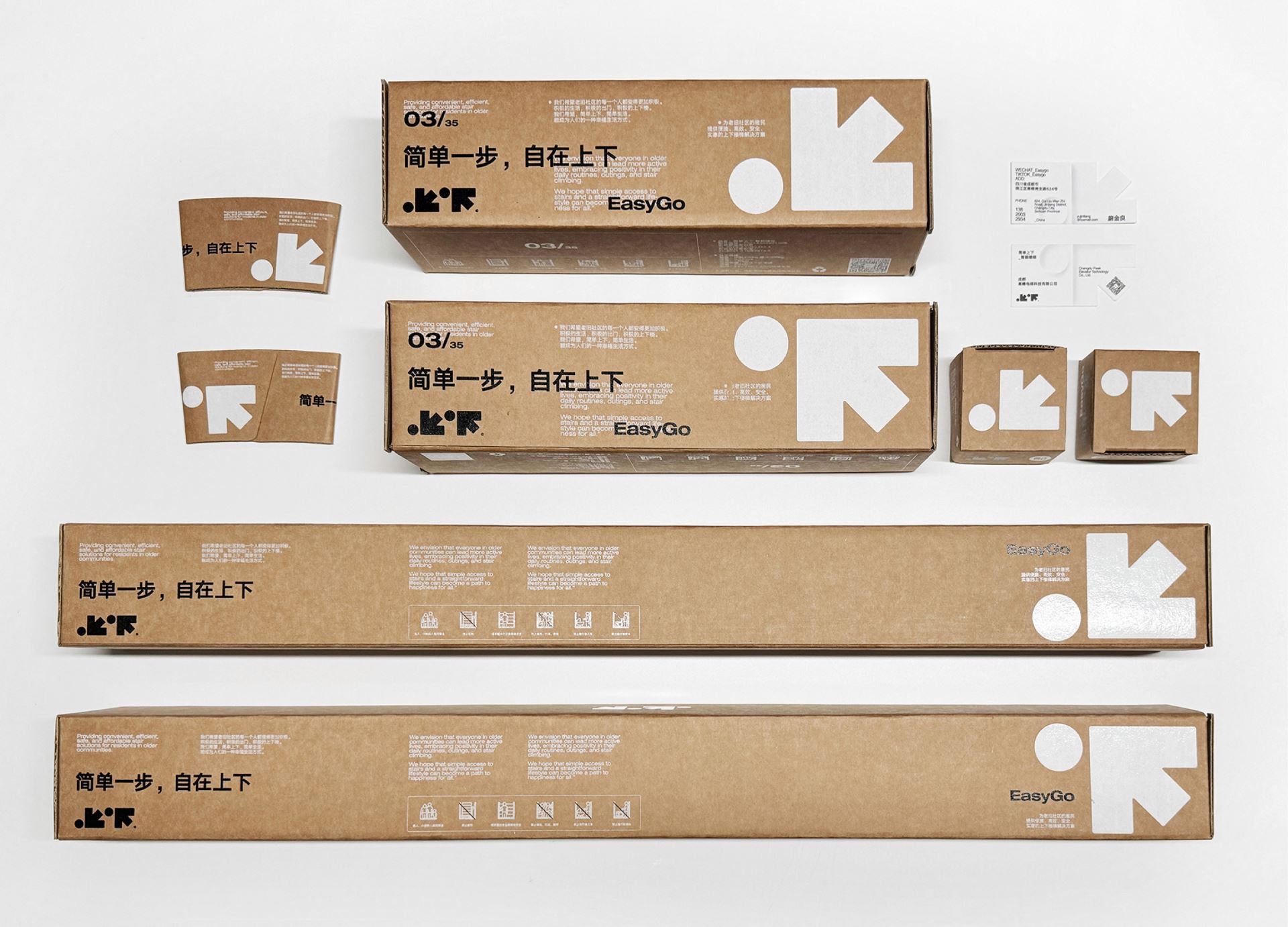 简单上下 EasyGo is a brand dedicated to elevator innovation. We direct all our efforts to address the needs of the elder adults who find it difficult to trudge up and down the stairs in older walk-up buildings in Asia where it is not possible to be retrofitted with an external elevator. Our design approach has considered that the elevator buyers tend to be young people, while the ultimate users are the elderly. Therefore, we adopt a balanced design concept to match layout and graphics and break language barriers to convey a sense of simplicity, directness, and authenticity in our visual identity. Our design inspiration draws from the concepts of "arrows" representing upward and downward movement, as well as the notion of "circles" symbolizing vitality. We artfully integrate the inherent meaning of the Chinese characters for "up" and "down" with their external form, resulting in a concise yet engaging visual representation. We remain committed to utilizing eco-friendly kraft paper material throughout, ensuring its consistent presence across all brand elements. This choice reflects our commitment to both simplicity and environmental consciousness.