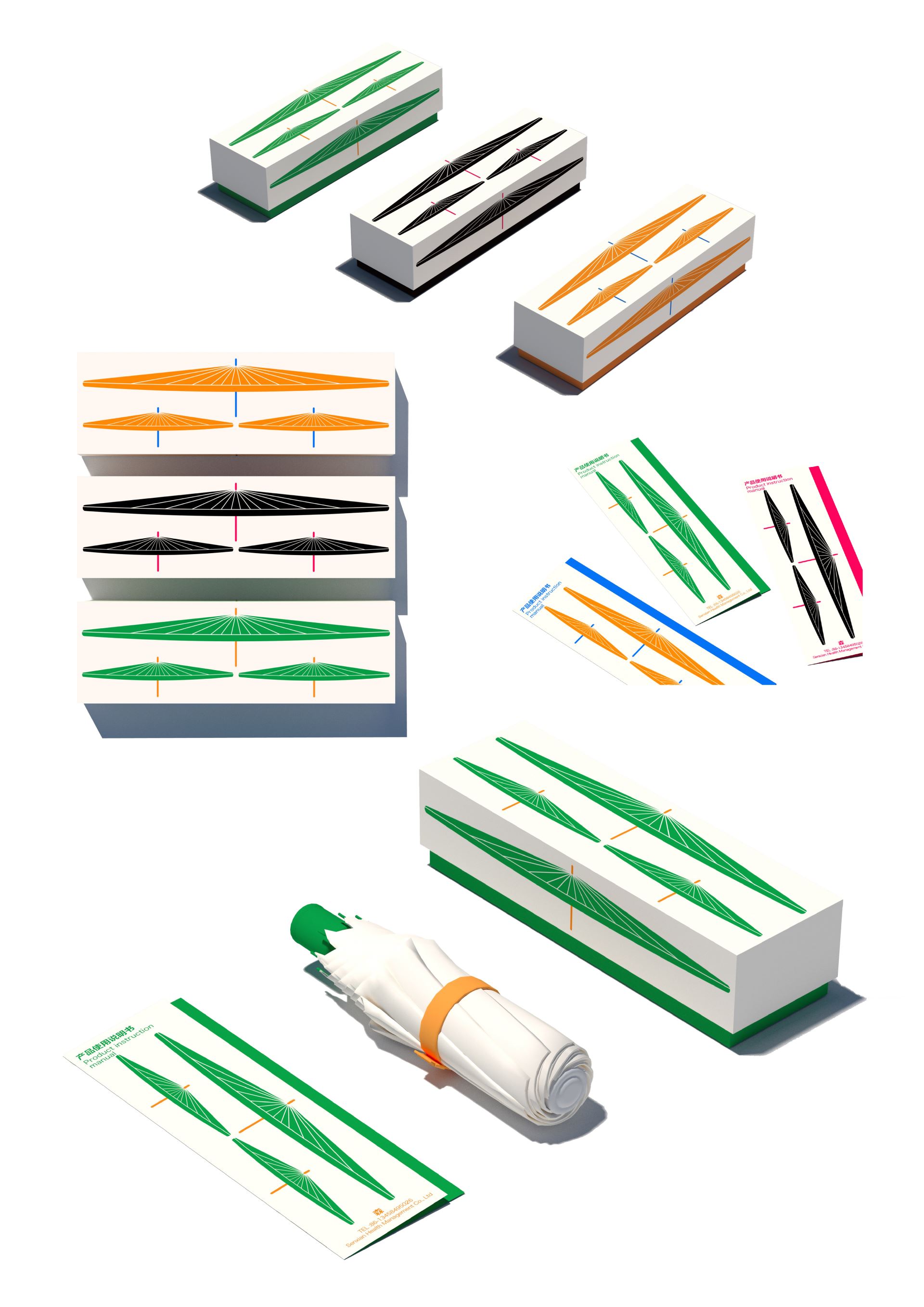 Sen Umbrella brand packaging, with the combination of umbrella patterns to form the Sen character, with patterns to build a new visual image, through the combination of patterns to form the Sen character, graphics combined with text design, so that consumers can firmly remember Sen and the excellent umbrella products brought by Sen, through bright color collocation, bring a more different visual experience. Communicate brand concept and product concept to consumers simply and clearly.