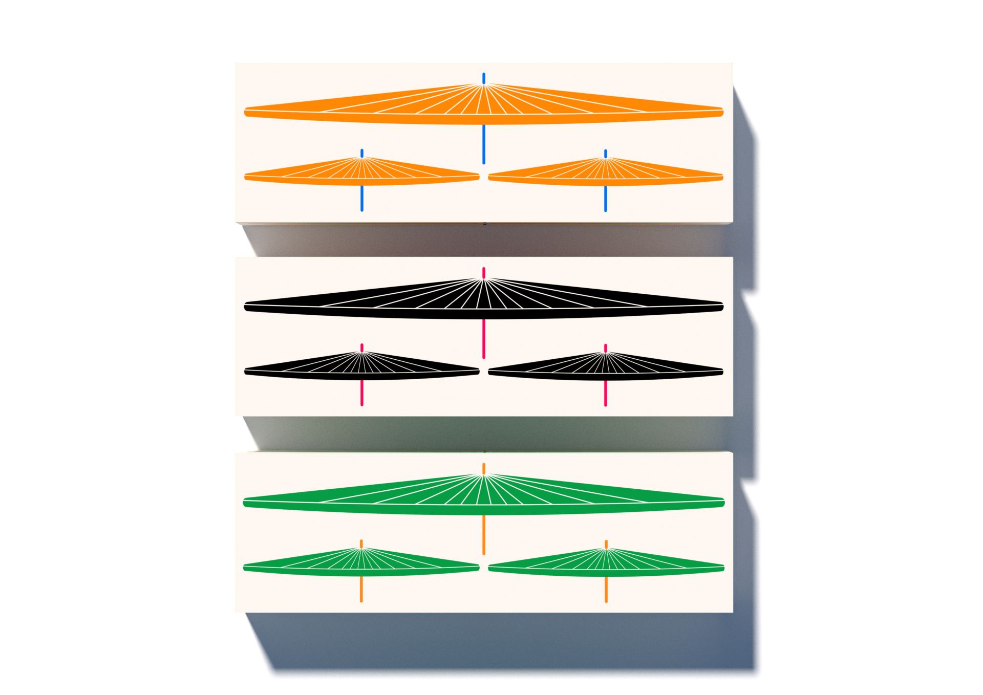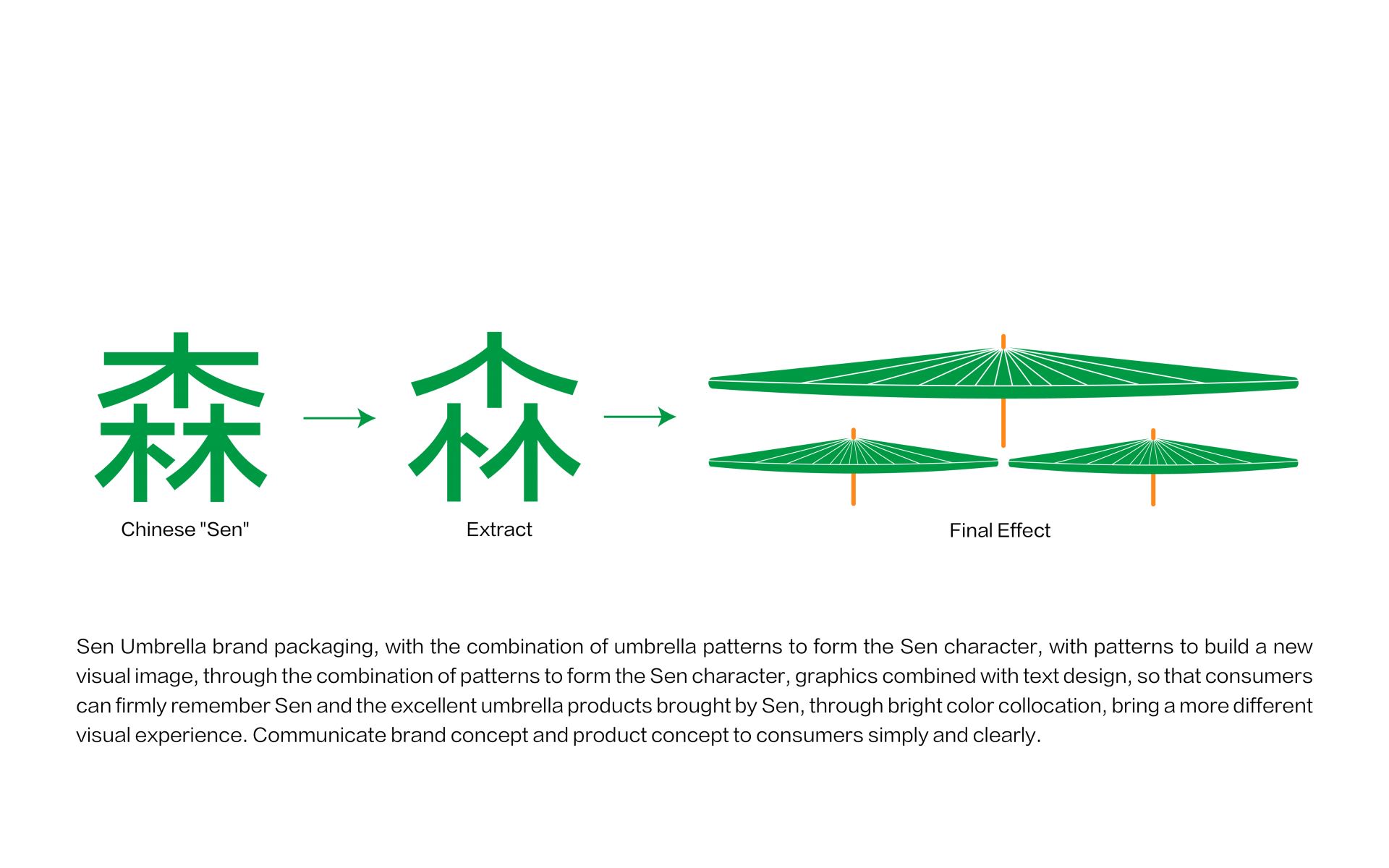 森-雨傘品牌包裝,用雨傘圖案組合構成森字,以圖案去構建一個新的視覺形象,透過圖案組合,組成森字,圖形結合文字的設計,讓消費者能牢牢記住森以及森帶來的優秀雨傘產品,透過鮮明的色彩搭配,帶來視覺上更不一樣的體驗,簡單明了向消費者傳達品牌理念與產品概念。