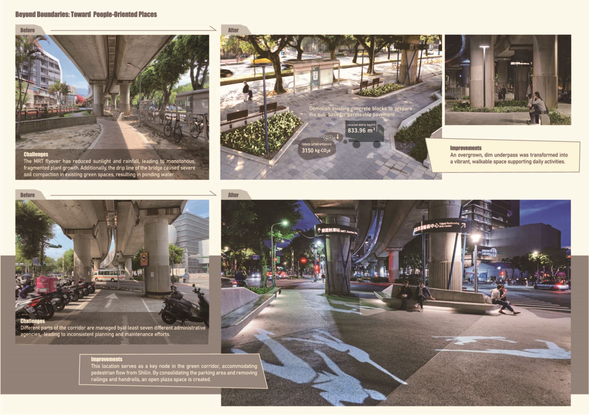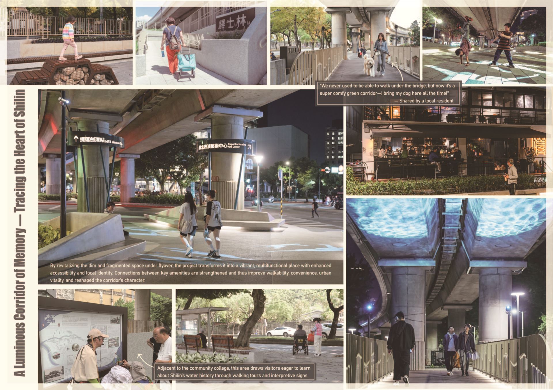 The Shilin–Jiantan MRT Green Corridor project reimagined an underutilized space beneath metro flyover and turned it into a people-oriented place that integrates local culture, history, and daily life. Located between Jiantan Mountain and the Keelung River, the project reconnects fragmented pedestrian routes and restored community cohesion once disrupted by infrastructure.