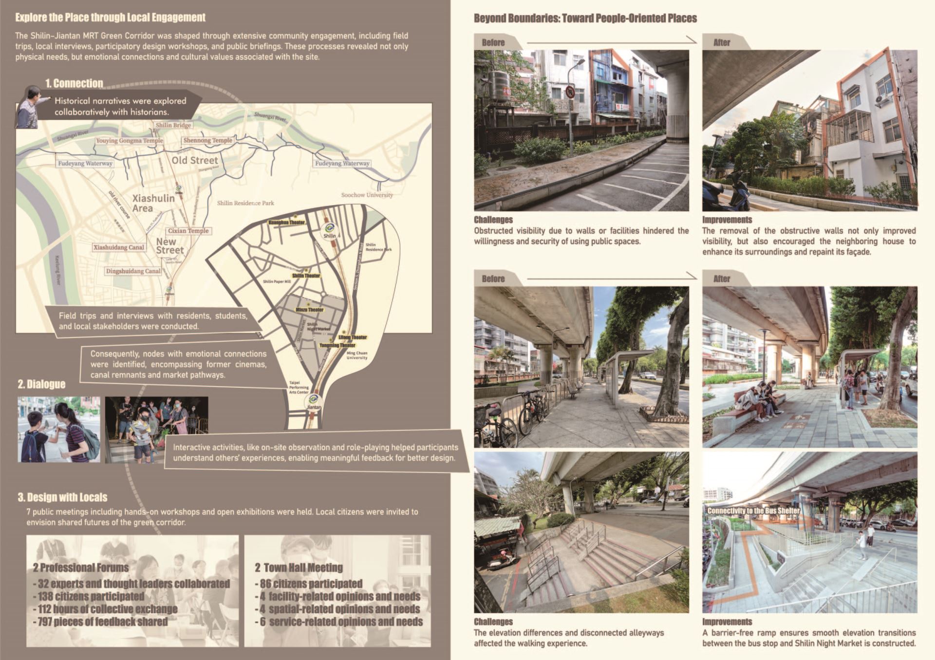 The green corridor encourages community engagement, ecological renewal, and placemaking, the project promoted pedestrian mobility, strengthened local identity, enhanced resilience, and shaped a sustainable and inclusive Shilin-Jiantan urban landscape.