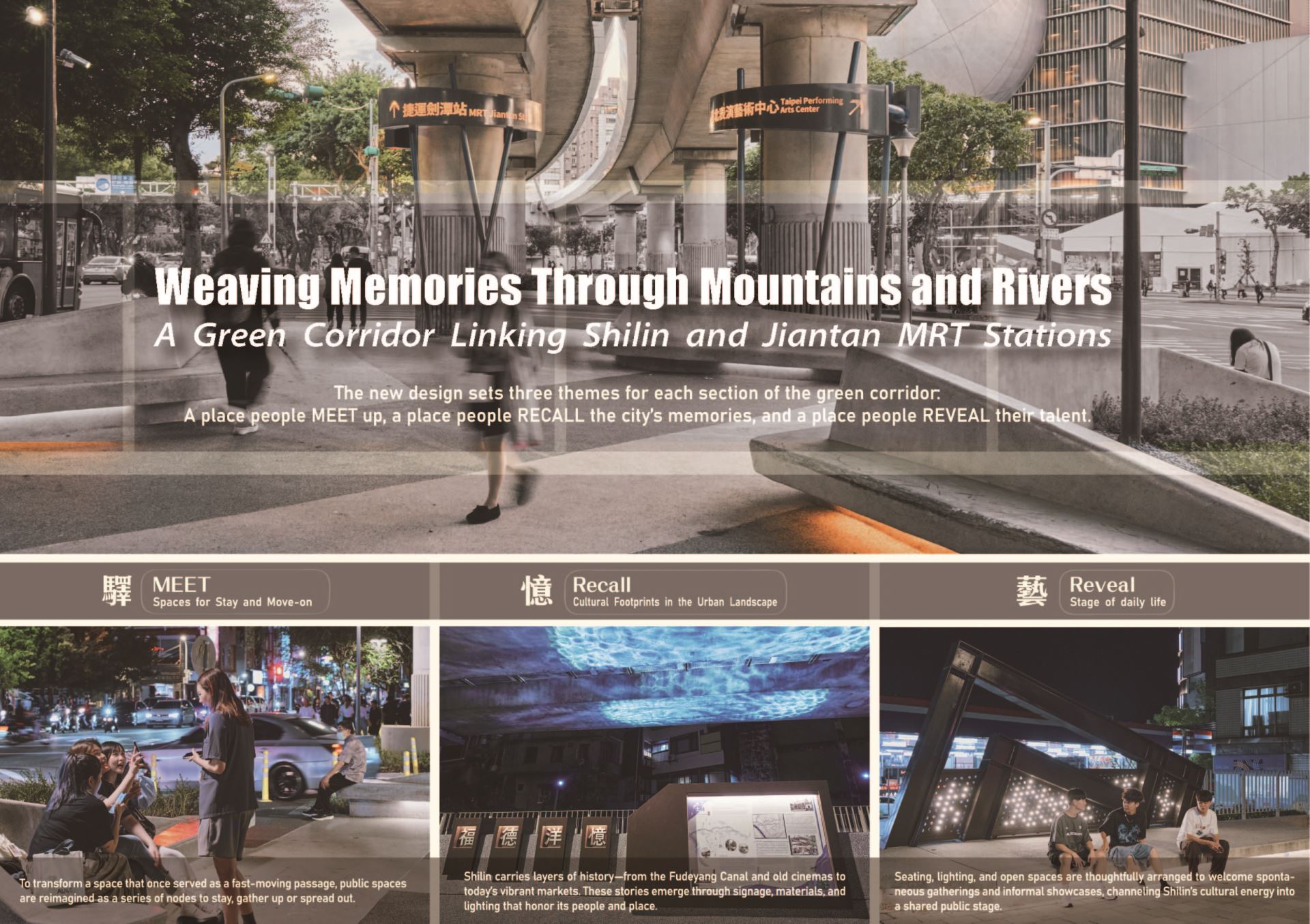 呼應昔日北淡線鐵路記憶及「福德洋」(士林早期水田地名)的水文歷史,提出「驛(Meet)、憶(Recall)、藝(Reveal)」三大主題策略,串連居民記憶與場域故事。以「光廊道」作為敘事主軸,搭配特色投影燈與橋上水波紋光影,在移步之間感受歷史紋理。讓綠廊從交通機能擴大為人本友善、在地認同、城市韌性與包容性的士林劍潭風貌。