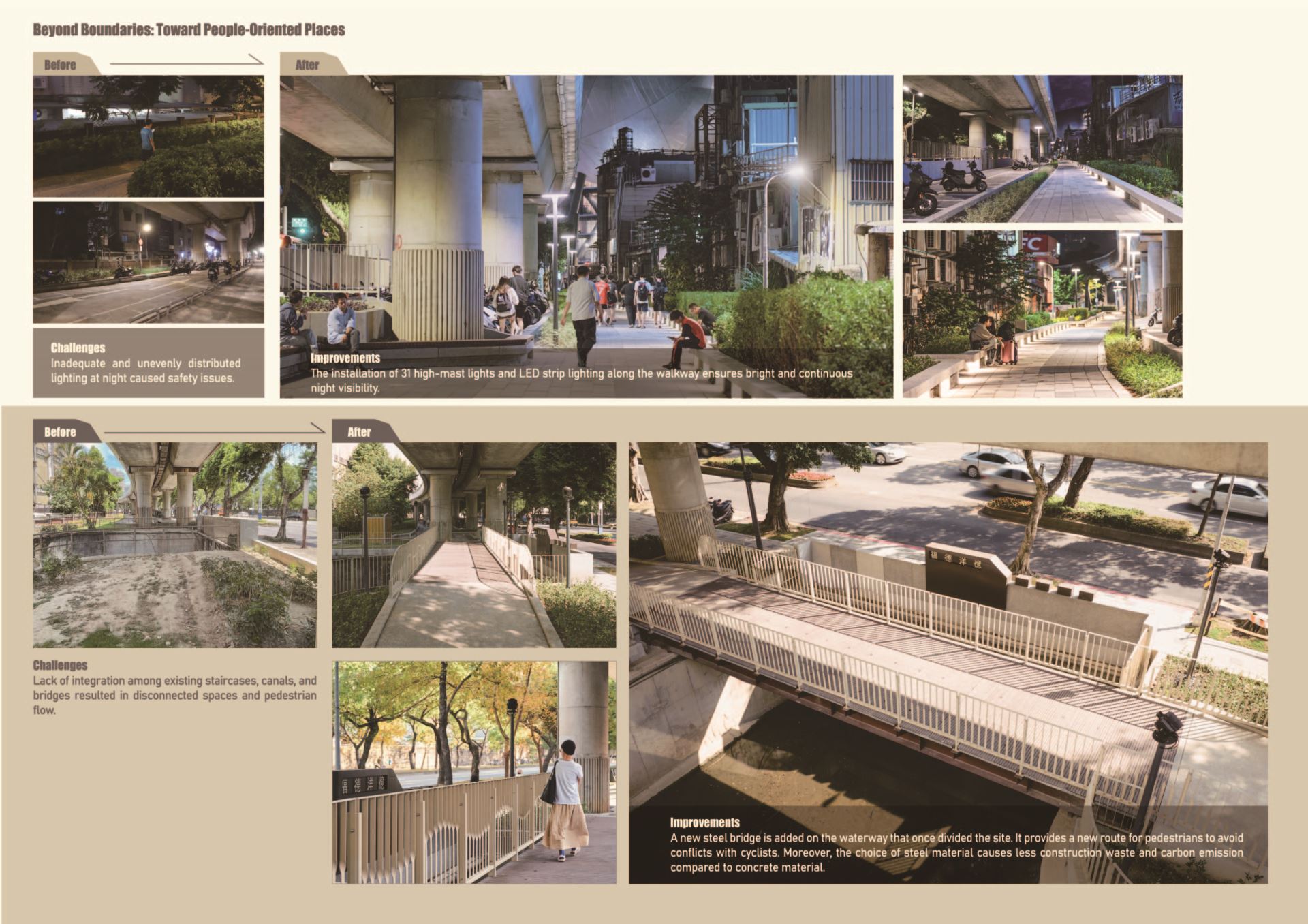 此段橋下因高差、動線紊亂,環境陰暗,長期阻礙民眾通行,並無形切割社區生活脈絡。本案以「織憶山河」為概念,致力翻轉空間形象,透過拆除牆體、調整綠地與減量車位,全面優化步行動線,鼓勵以步行結合大眾運輸的日常移動模式。藉此修補因捷運設施所造成的社區斷裂,營造融合在地紋理且人本友善的步行綠廊。