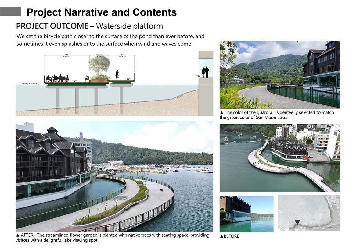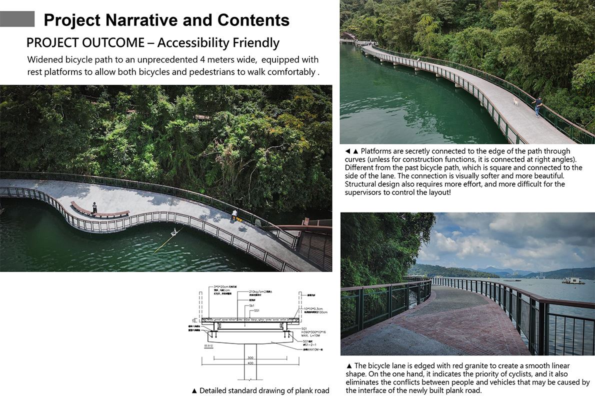 鑑於伊達邵的高遊客量,我們把這條重要的自行車道拉寬到環潭區域前所未見的4公尺寬,並搭配各式休憩平台,讓自行車與行人都能舒適行走。