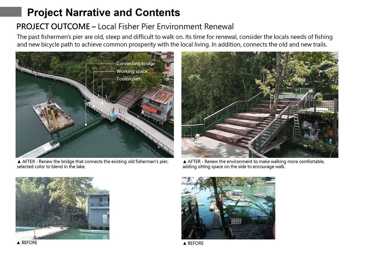 The past fishermen's pier are old and difficult to walk on. consider the locals needs of fishing and new bicycle path to achieve common prosperity with the local living. In addition, connects the old and new trails.