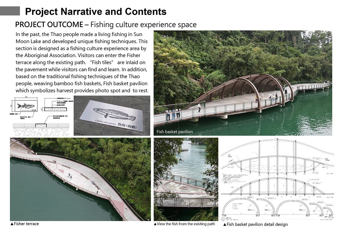 昔日邵族人於日月潭捕撈為生,發展出獨特漁撈技巧。本路段於原民會定位為漁撈文化體驗區。遊客可沿著既有步道進入漁民碼頭,舖面上鑲嵌「解說地磚」認識潭水孕育的各式水產。另外也以邵族傳統漁撈技法中,竹編魚簍為發想,設置魚簍花架休憩區,以及象徵豐收的大於平台休憩區。