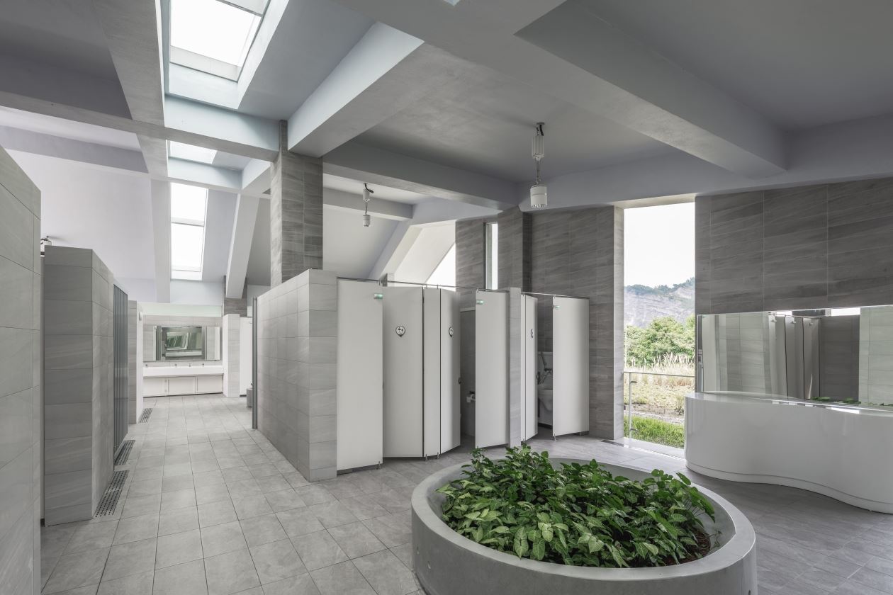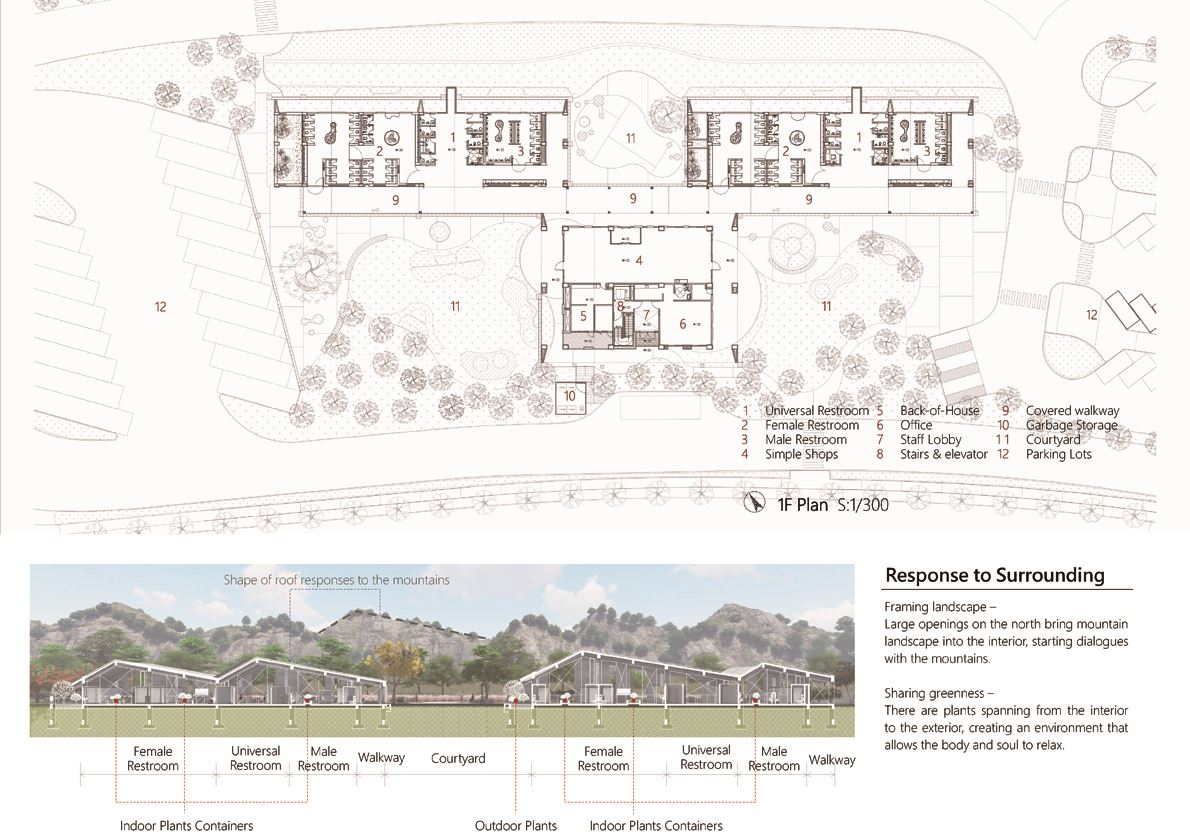 將壯麗山峰以框景引入建築,成為一幅幅美麗的畫作,使人們進到空間便能欣賞在地地景,感知環境並達到放鬆的如廁體驗。廁間分區配置、動線明確,並設置兒童衛生器具、哺集乳室、無障礙、親子、性別友善及穆斯林廁所,滿足友善與多元性。