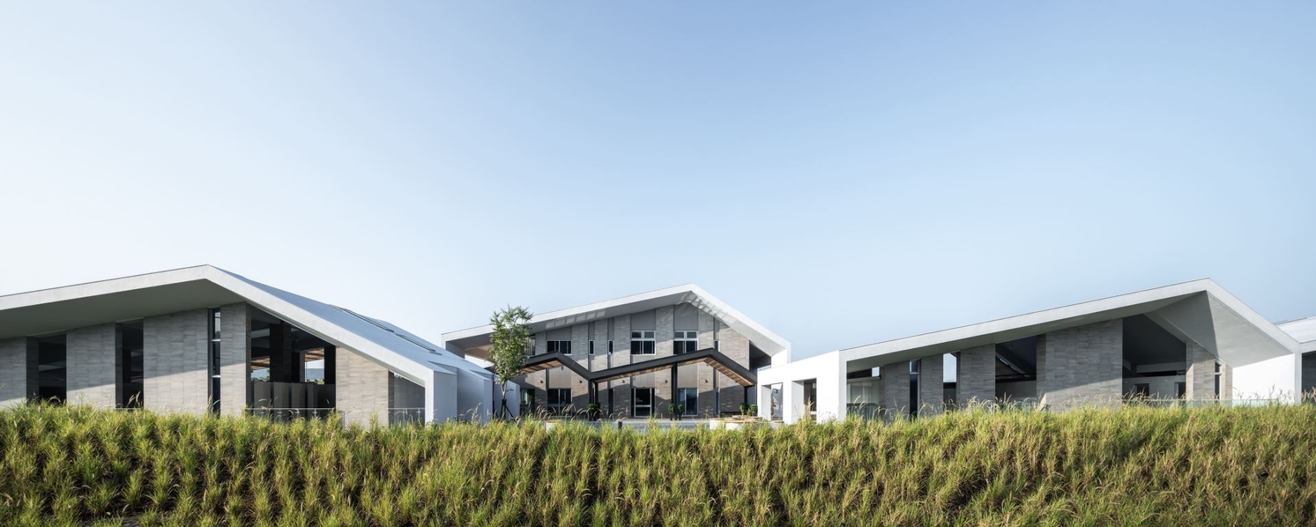 建築立面開口與群山對話,透空處使自然山壁納入為立面質感的展現。斜屋頂創造浮力通風,讓空氣自然對流,帶走水氣與穢氣。棟與棟之間以格柵雨遮通廊串聯,旅客穿梭其間,再現人們來往東西,行經草屯的歷史意象。陽光透過木紋格柵灑落地面及牆面,隨著時間推移,猶如山林中樹下的光影,讓旅客感受時光,與光影互動。