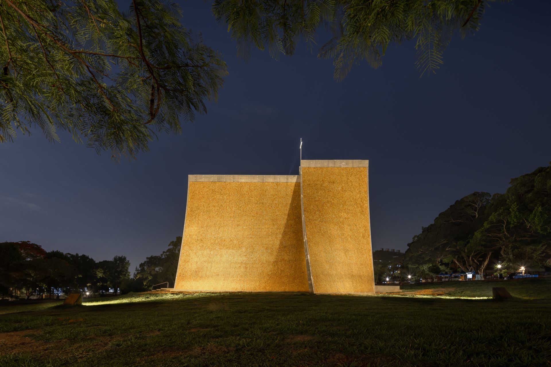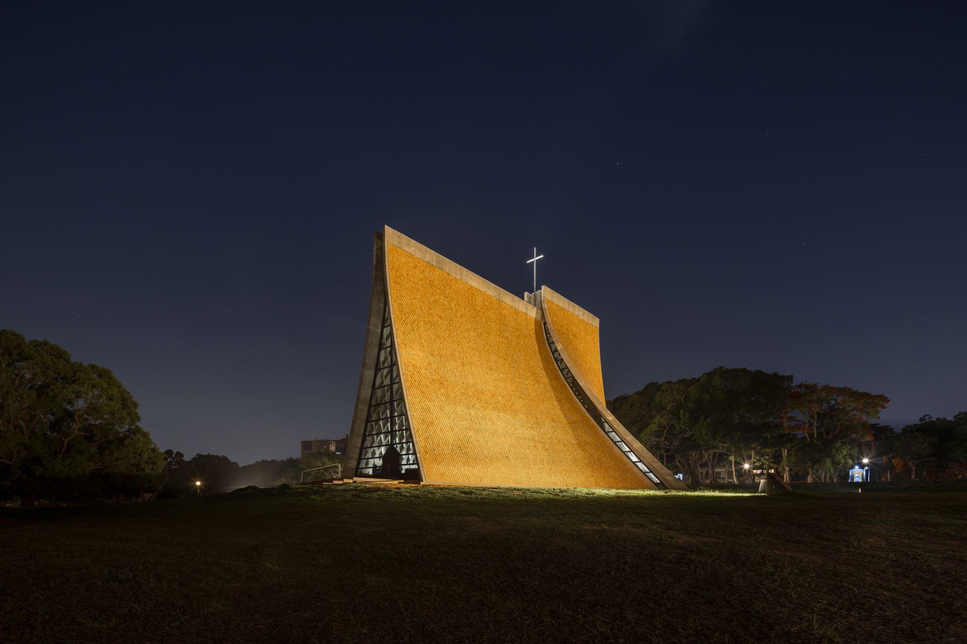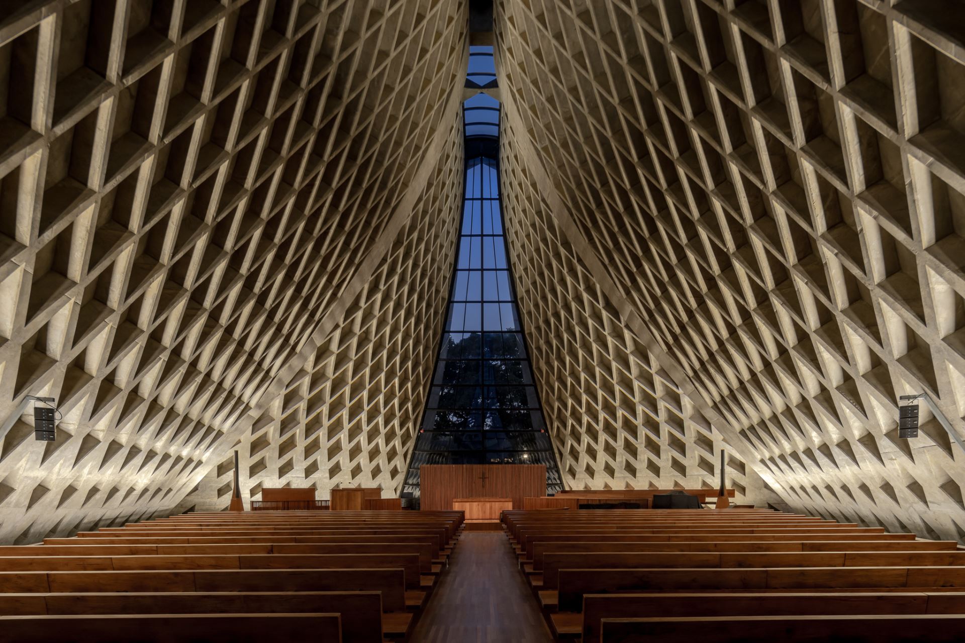 Rooted in restraint, the design lets light breathe with the chapel’s curved concrete, allowing architecture and illumination to speak as one from day to night.