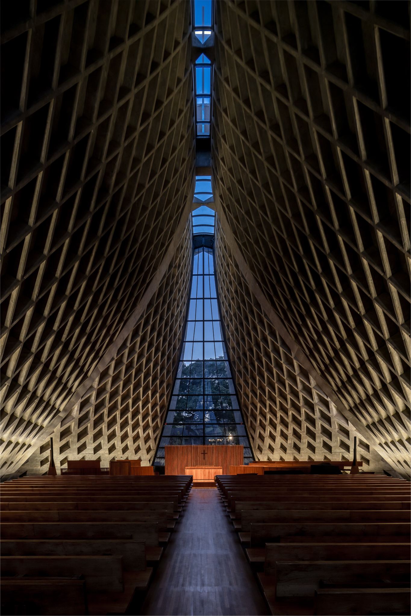 此次修復計畫,回溯建築師原初構想,於尊重空間精神前提下,引入現代化燈具與整合性光環境設計。透過精準運用人工光,營造如天光般的柔和與優雅,細膩襯托曲面稜線;夜幕降臨,暖調微光勾勒結構輪廓,使路思義教堂在白晝與星空下皆綻放雋永光彩,重現其神聖與詩意。