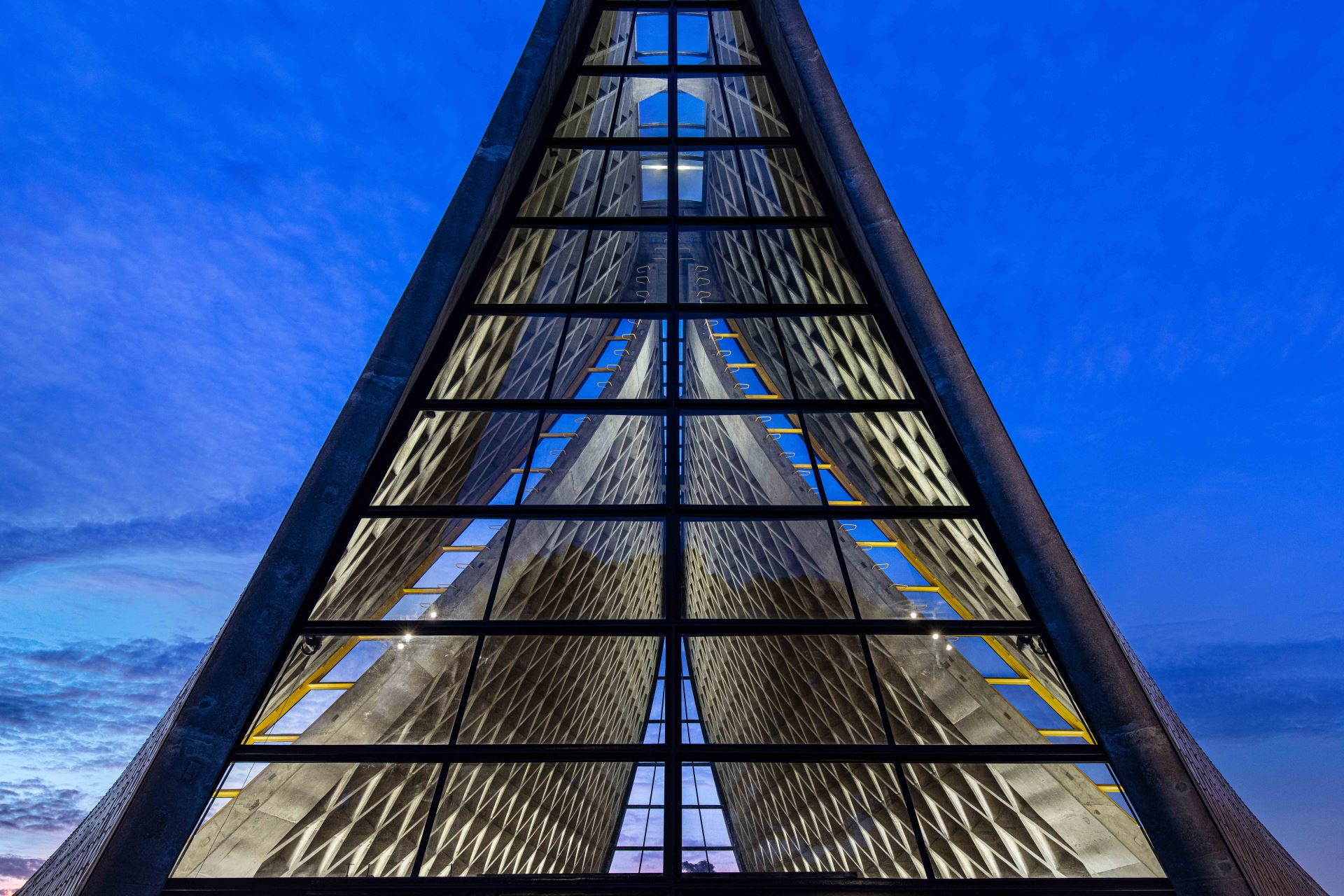 建築本體由四片三度曲面板構成,形似倒置船腹,上寬下收,予人沉穩厚實之感。屋脊設有玻璃天窗,營造「一線天」的意象;側窗溢入斜光,為室內增添神秘韻味。從正立面或四十五度角內視,其流暢曲線之美尤其動人。
