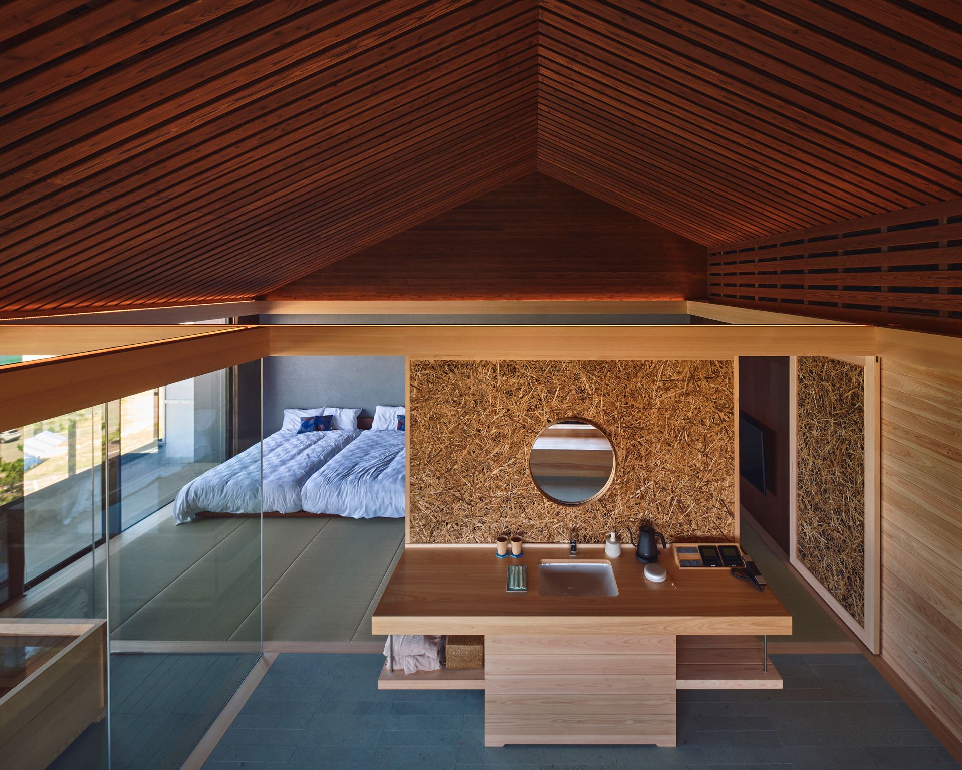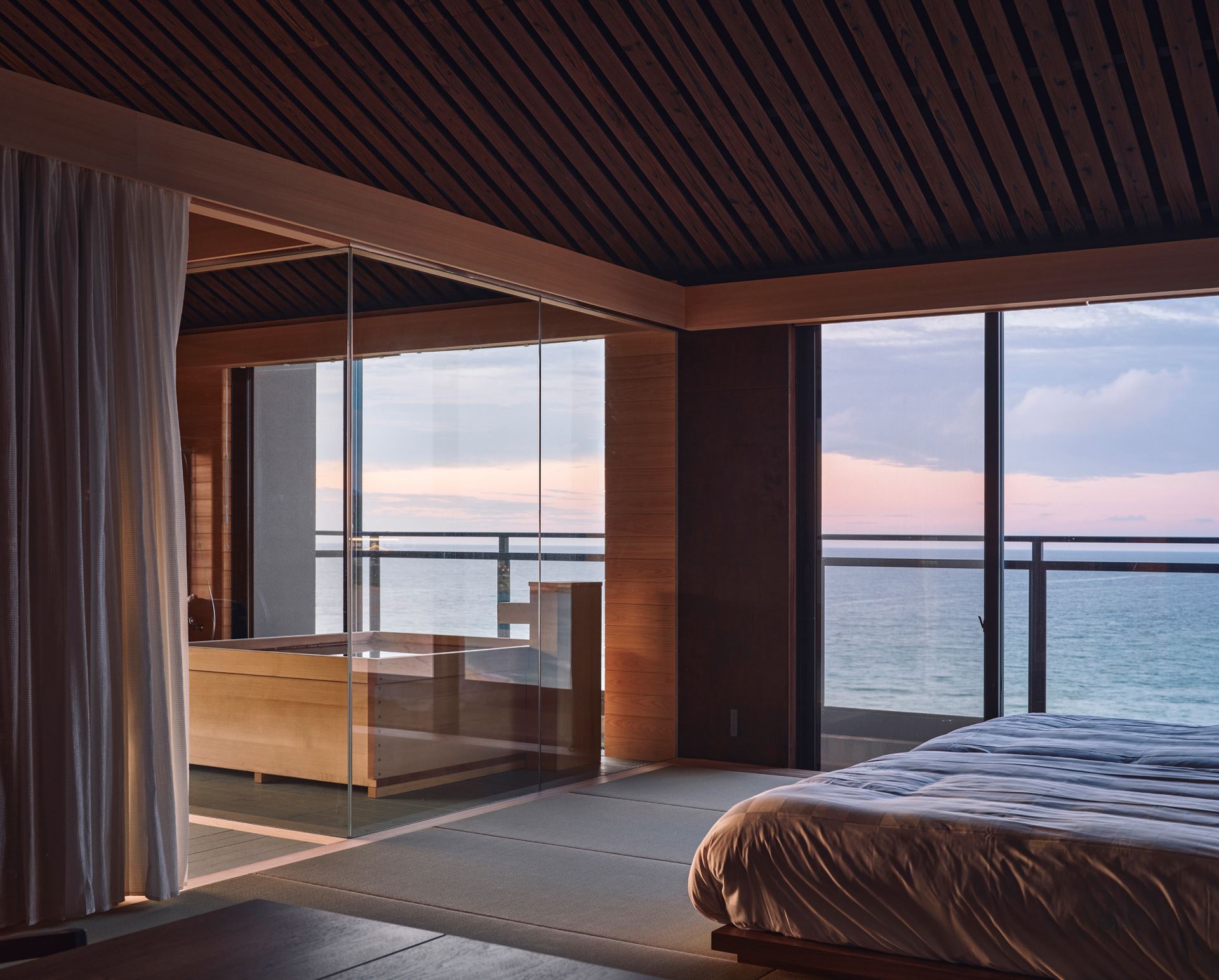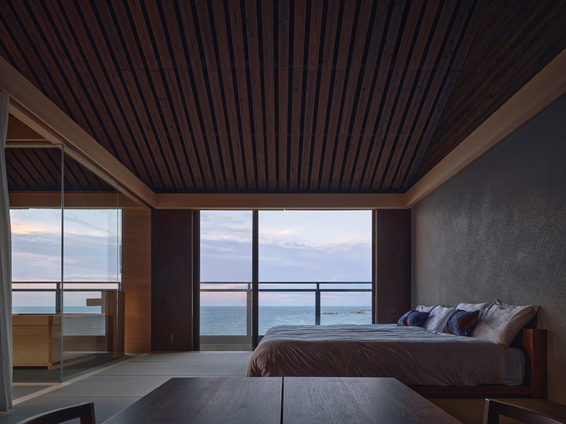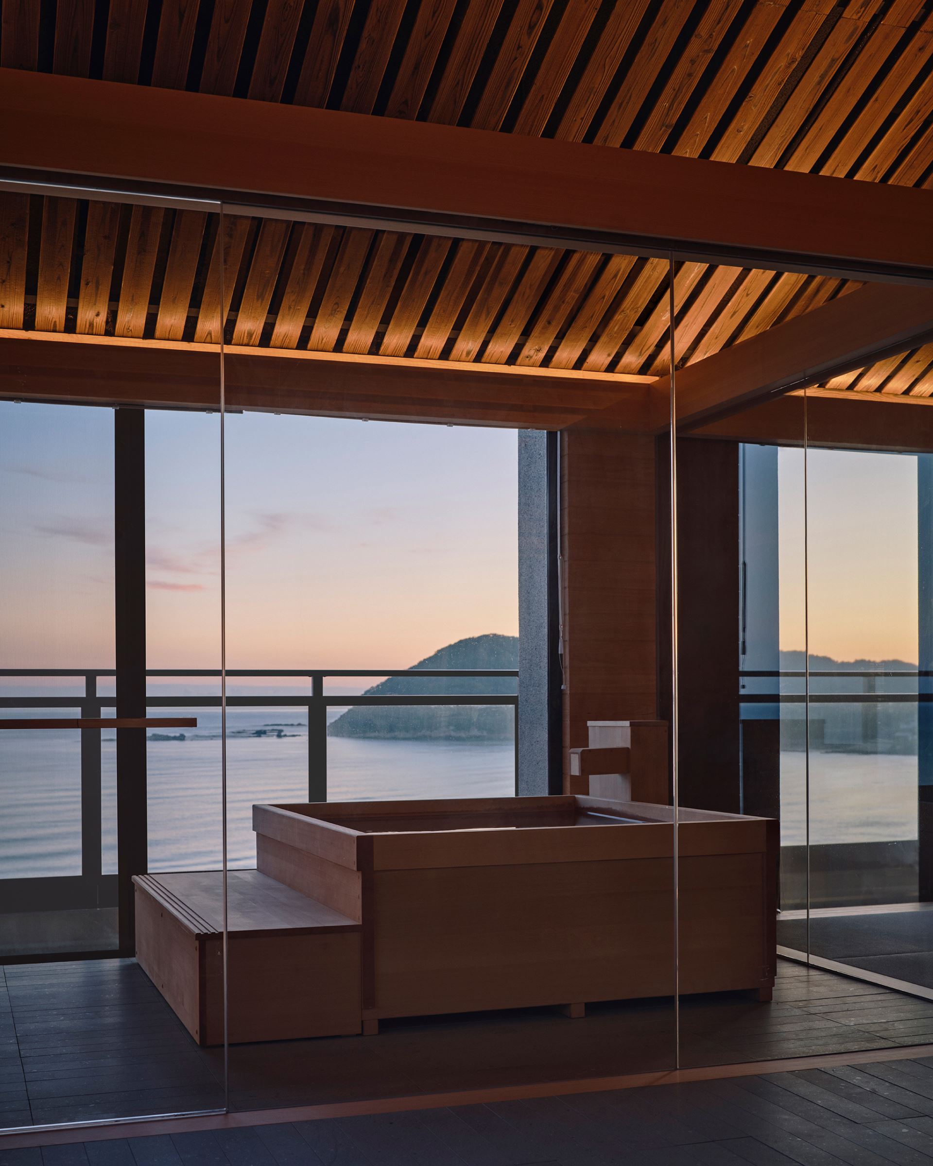 本計畫重新定義了京丹後一家日式旅館的頂層,打造出本身就是目的地般的客房。業主希望吸引遊客來到這個旅遊資源有限的地區,這個願望也影響了我們的設計理念:以壯麗的日本海為絕對主角,建築空間則作為尊重自然的背景,與自然環境和當地歷史融為一體。一個關鍵原則是使用傳統的水準木樑⸺“nageshi”,它不僅美觀,而且便於未來的升級改造和設備規劃,確保了建築的持久性。這體現了日本人珍惜和維護事物的價值觀。我們融入了傳統的建築元素,引導遊客的視線投向大海,促進與景觀的深度互動。我們與當地工匠合作,將丹丹後縐紗、紙燈籠等傳統工藝融入設計,使客房成為文化導覽。這種區域復興模式創造了新的客流,提升了京丹後的旅遊價值。