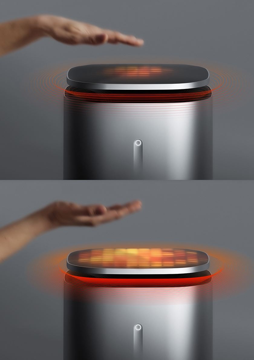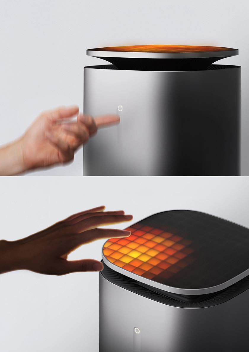Filo 採用像素化燈光面板模擬跳動的火焰,透過像素數量和亮度即時回饋加熱強度,讓暖氣過程更具感知性和氛圍感。頂部採用懸浮式設計,使用者可自然地將手伸近取暖口;當感應到動作時,Filo 會自動開啟 5 分鐘的熱量增強響應,彷彿火焰因人而動,富有生命感。