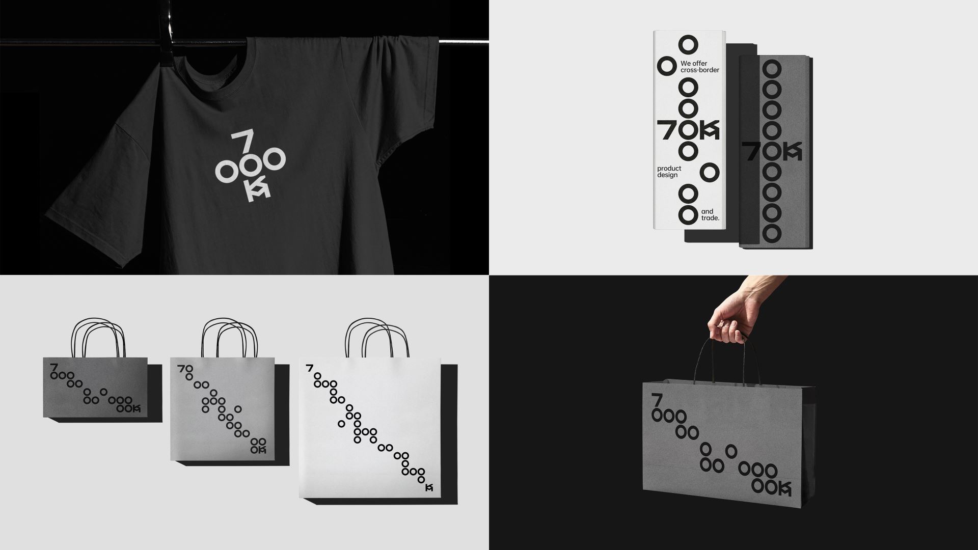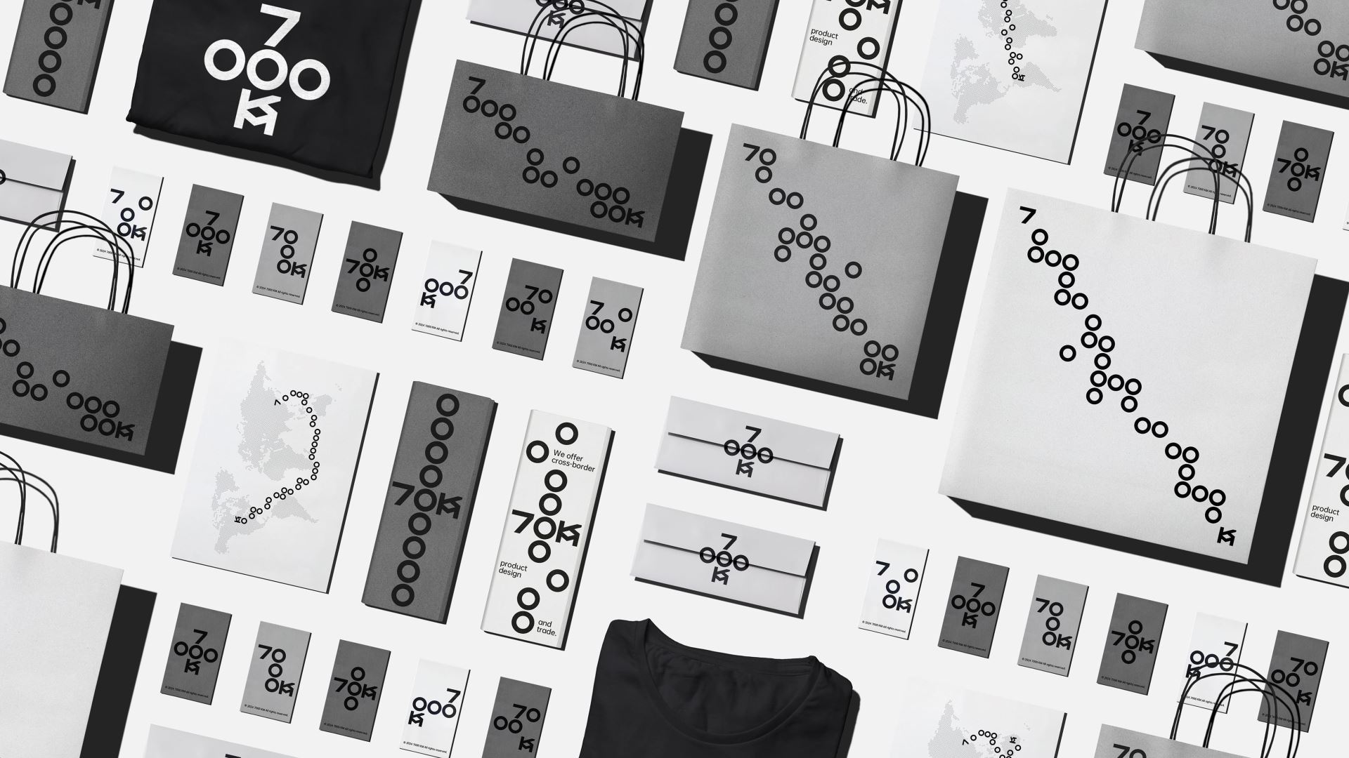 Our understanding of international trade and the Silk Road is that it is free, flexible, and friendly like a network spreading out, so we created a logo and visual identity for 7000KM based on a grid system. 7000KM's letters are condensed into a 5×5 grid, arranged and shuttled under the rules, so that the logo becomes dynamic and interesting, echoing the freedom and flexibility of the trade network. At the same time, the number 0 can also be extended into a "map route" representing trade and the silk road, linking from a starting point (the number 7) to an end point (the letter KM), which strengthens the impression of the brand, enriches the brand's emotional attributes, and helps the brand to develop more quickly.